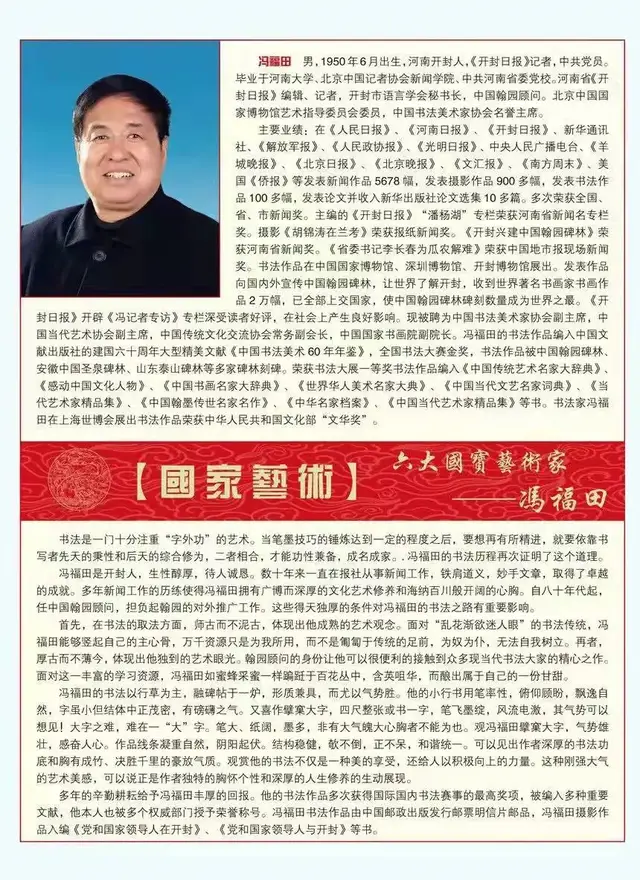 《开封日报》开辟《冯记者专访》专栏深受读者好评,在社会上产生良好影响。现被聘为中国书法美术家协会副主席,中国当代艺术协会副主席,中国传统文化交流协会常务副会长,中国国家书画院副院长。