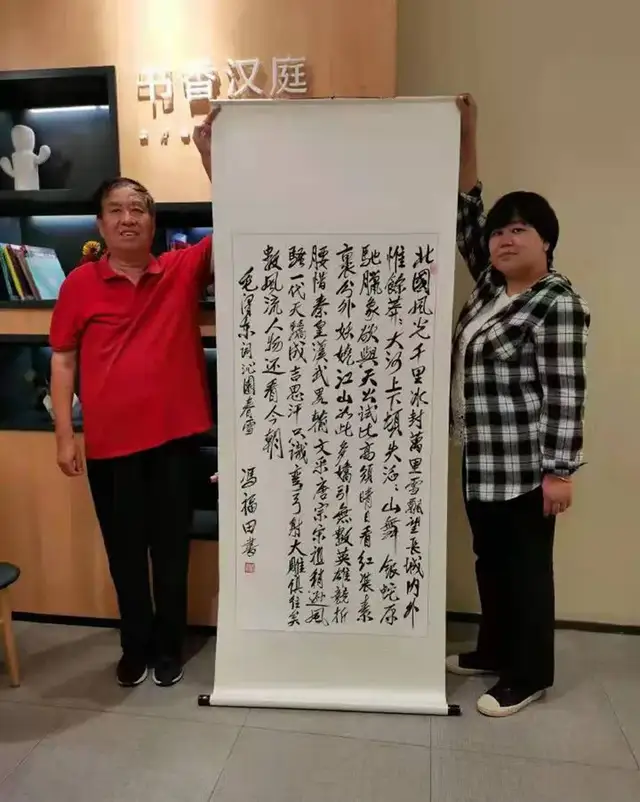 冯福田的书法以行草为主,融碑帖于一炉,形质兼具,而尤以气势胜。他的小行书用笔率性,俯仰顾盼,飘逸自然,字虽小但结体中正茂密,有磅礴之气。又喜作擘窠大字,四尺整张或书一字,笔飞墨绽,风流电激,其气势可以想见!大字之难,难在一“大”字。笔大、纸阔,墨多,非有大气魄大心胸者不能为也。观冯福田擘窠大字,气势雄壮,感奋人心。作品线条凝重自然,阴阳起伏。结构稳健,欹不倒,正不呆,和谐统一。可以见出作者深厚的书法功底和胸有成竹、决胜千里的豪放气质。观赏他的书法不仅是一种美的享受,还给人以积极向.上的力量。这种刚强大气的艺术美感,可以说正是作者独特的胸怀个性和深厚的人生修养的生动展现。