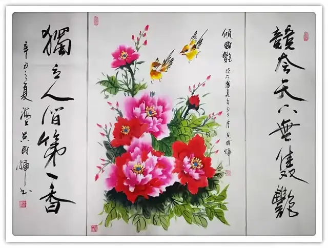 色彩在先生的作品中,亦是有着不可替代的位置。在用色上,先生创造艳丽形象的同时,还充分保持住了中国画的高雅格调,做到了色彩不因艳而显俗,他在北方画派偏用单纯色彩来补充墨色的特点上,加入了岭南派的艳丽色彩,两者进行了有机的结合,可以说是在用色上下足了功夫,在先生的色彩加持下,其花鸟焕然生新,前贤画花,总多以胭脂作花,花青为叶,色泽轻淡,以此显高雅之态,然先生却将其突破,在红中加白,尽显花朵亮丽夺目之势,叶子也掺以墨汁,如此既不失传统,又不失个人特质,从根本上讲,先生的色彩格调,是纯正的,更是独具匠心的。