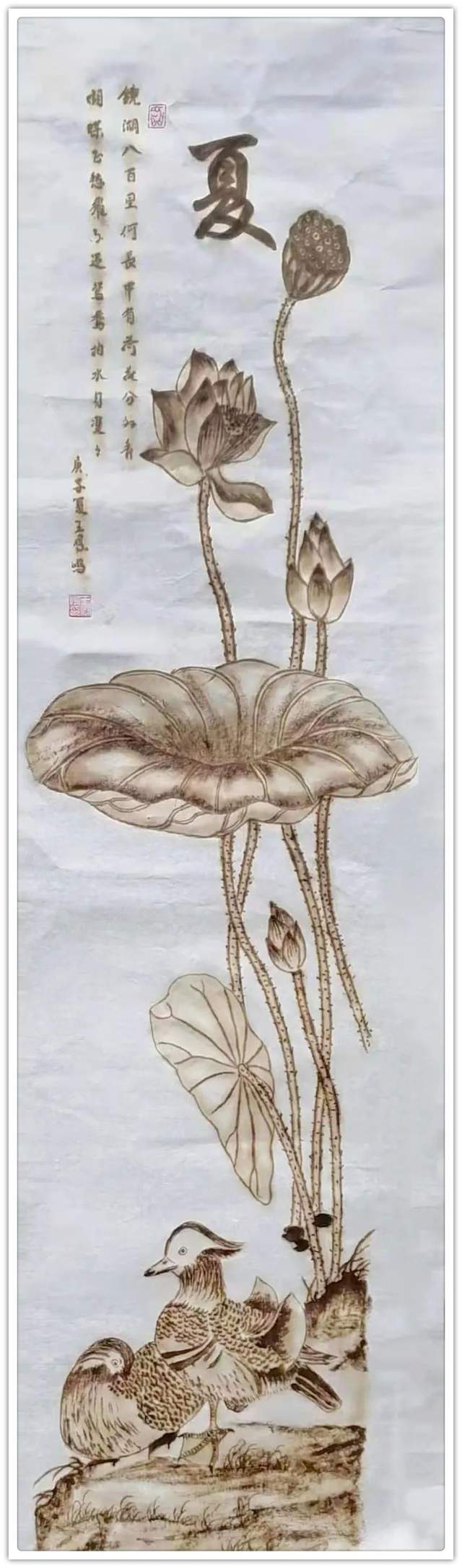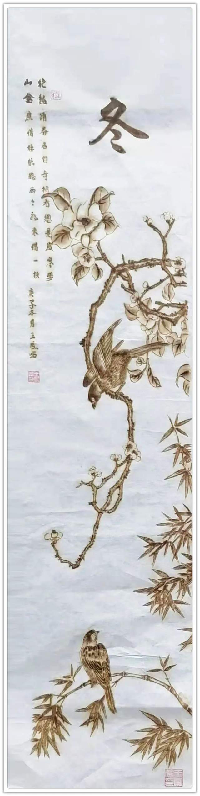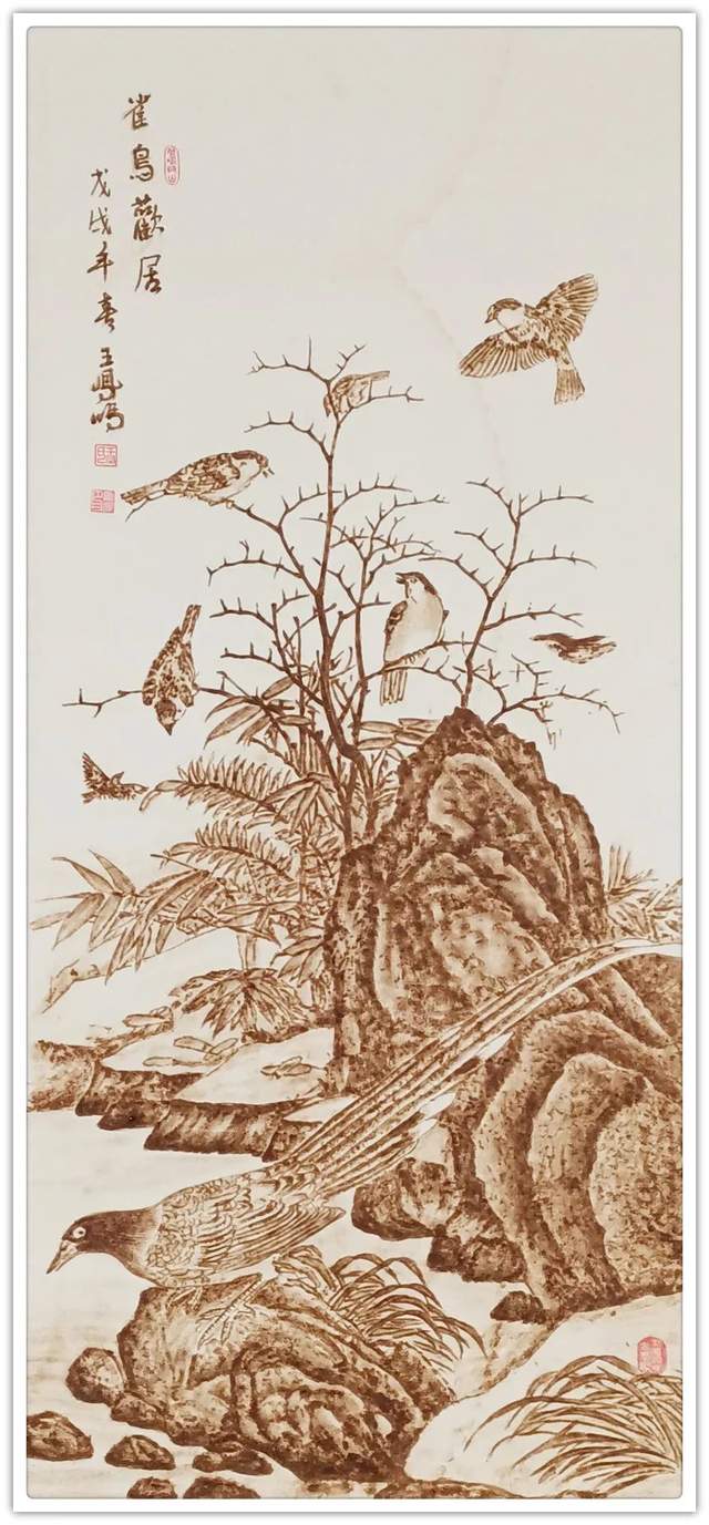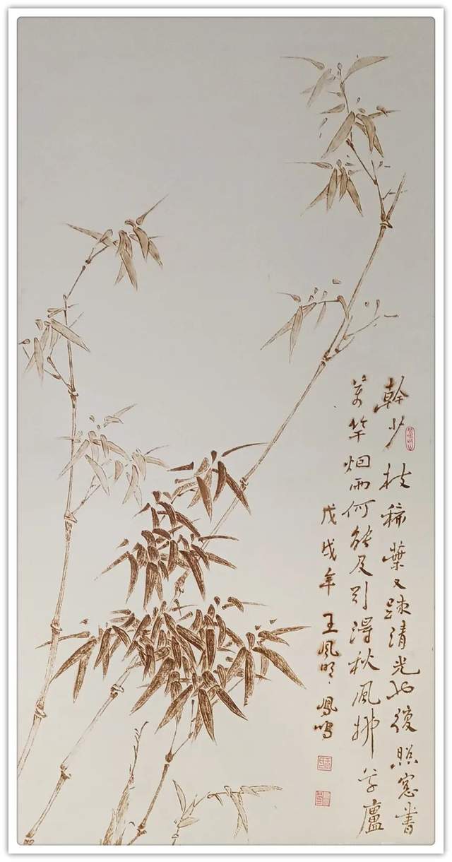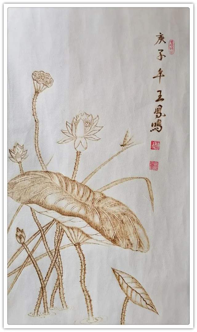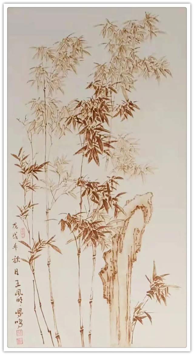 他在宣纸上烙画,题材非常非常。花鸟、山水、人物、动物诸门样样精通,是一位全能式的烙画贤家。谓之为贤,是因为他的烙画绝不是依程序制作的匠工作品,而是按照艺术原则进行创作的精彩!烙画者亦非王凤鸣一人,为什么他的烙画能脱颖而出,烙得与众不同呢?究其重要原因,就在于王凤鸣作烙画,有深厚的传统笔墨作画的娴熟修养,从他创作的题材来看,无论是山水花鸟作品,都有骨法用笔的卓越实践,线条造型的能力非常强大,这是中国画审美的本质属性,也是东方文化线作精气神的原则。