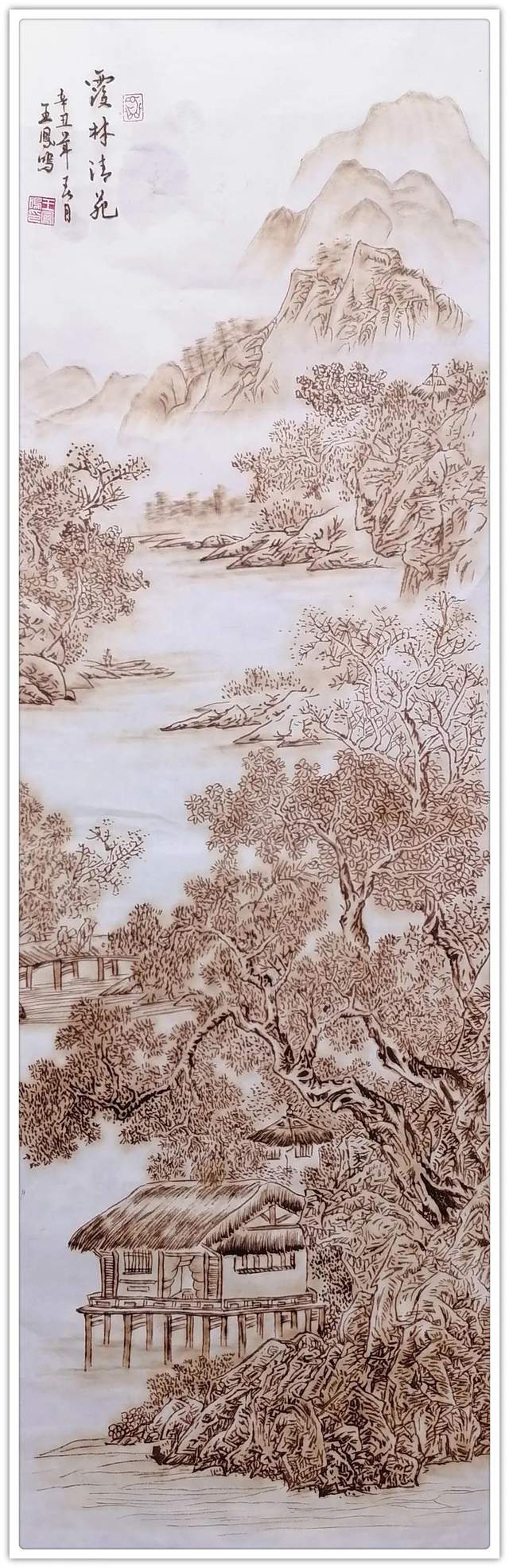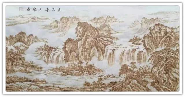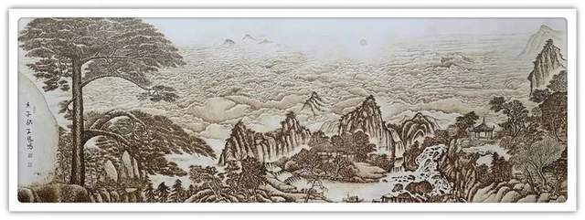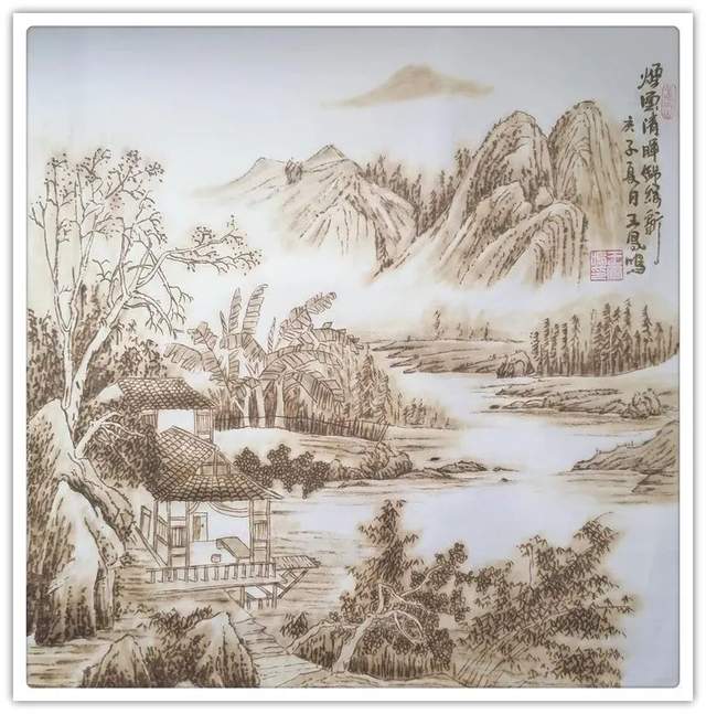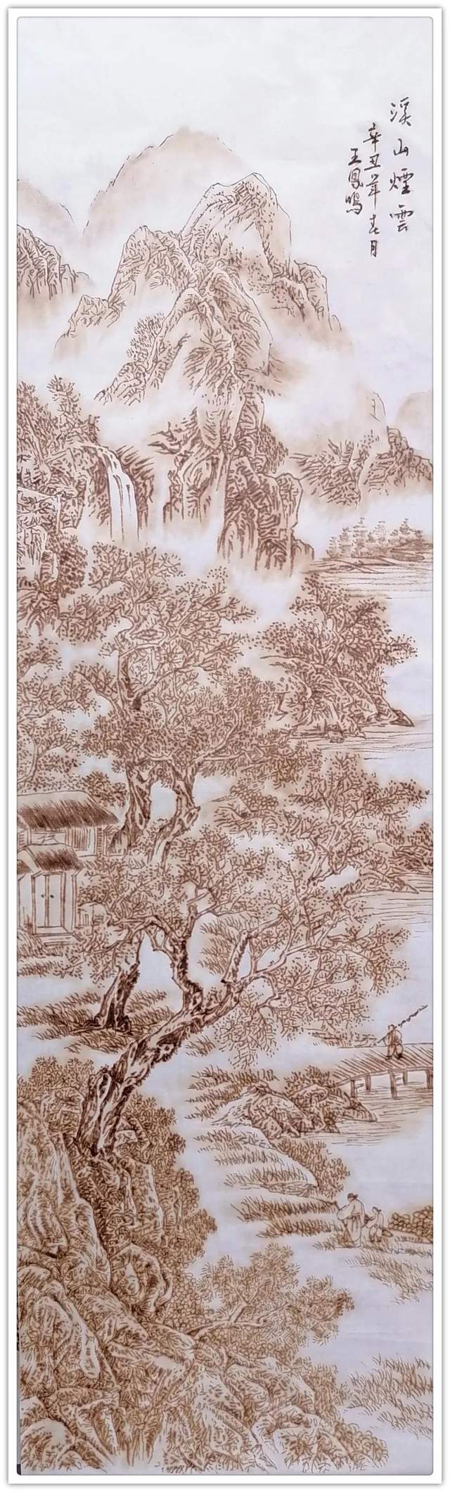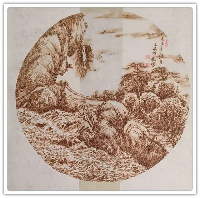 执烙如执笔,火则为墨,在宣纸上可以一气呵成作长线,也可以顿挫有效作短线。长短相较,高低相迎,一幅山水总有千条线,万万皴,不见一根线条成为散兵游勇,一并的组织有序,绝不凌乱!这种执烙烧线的技法,已经是炉火纯青,出神入化。所以他作烙画,造型问题解决得相当到位,通过兼工带写的烙作,可以把云上山巅写意得四面俊厚!法之达极称为巧,艺之到巅当是妙。王凤鸣用作水墨山水画的觉悟作烙画,画质巧而妙,盈满诗意,气韵生动,具有赏心悦目的欣赏魅力,挂于屏障,蓬荜生辉!
