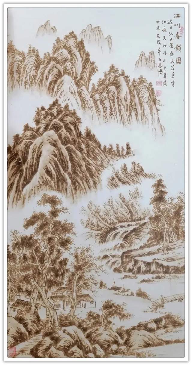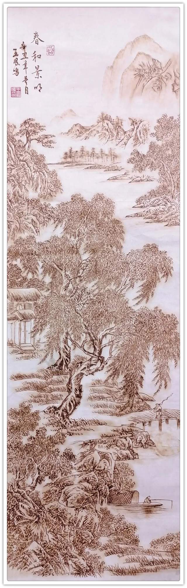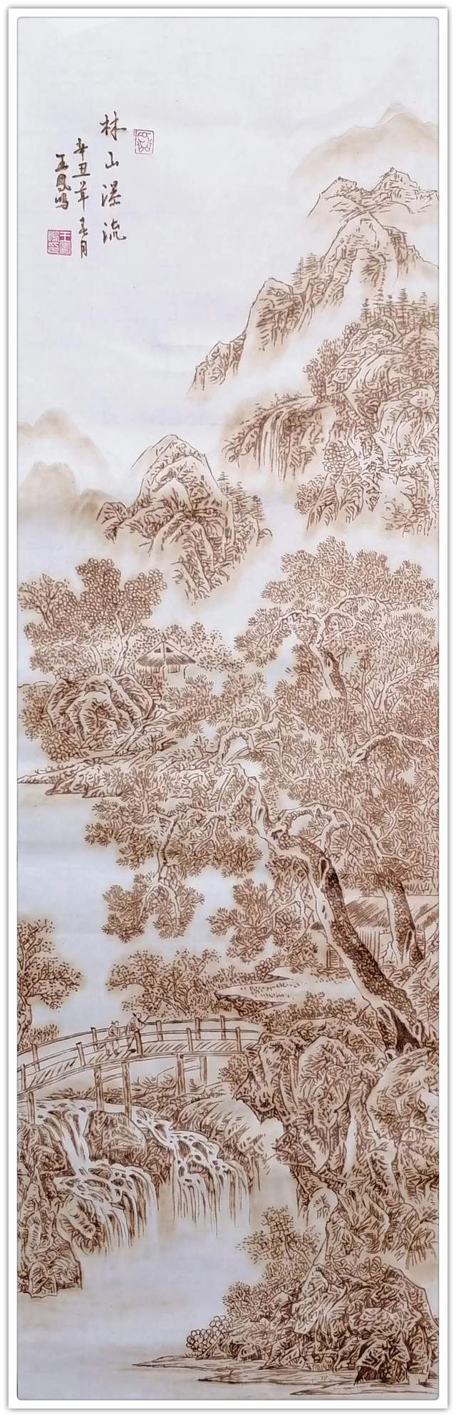 执烙如执笔,火则为墨,在宣纸上可以一气呵成作长线,也可以顿挫有效作短线。长短相较,高低相迎,一幅山水总有千条线,万万皴,不见一根线条成为散兵游勇,一并的组织有序,绝不凌乱!这种执烙烧线的技法,已经是炉火纯青,出神入化。所以他作烙画,造型问题解决得相当到位,通过兼工带写的烙作,可以把云上山巅写意得四面俊厚!法之达极称为巧,艺之到巅当是妙。王凤鸣用作水墨山水画的觉悟作烙画,画质巧而妙,盈满诗意,气韵生动,具有赏心悦目的欣赏魅力,挂于屏障,蓬荜生辉!