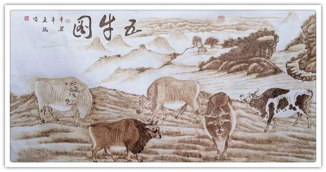 他烙画,烧制层次富有气韵生动的唯妙。通过火候的变化与控制,可以在纸面上烙出水墨的浓淡干湿焦!一幅老子图,除了是烧线的佳作,也是烧出墨韵天质的上品!在大的块面空间里表现出水墨变化的氤氲滋润,把人物烙画创作出曹衣出水、吴带当风的意象。没有秘籍,绝无可能!他烙作《五牛图》法通古风,复建中国传世国宝的另一个承袭平台,既有技法的精湛,也有文化传播的功勋。