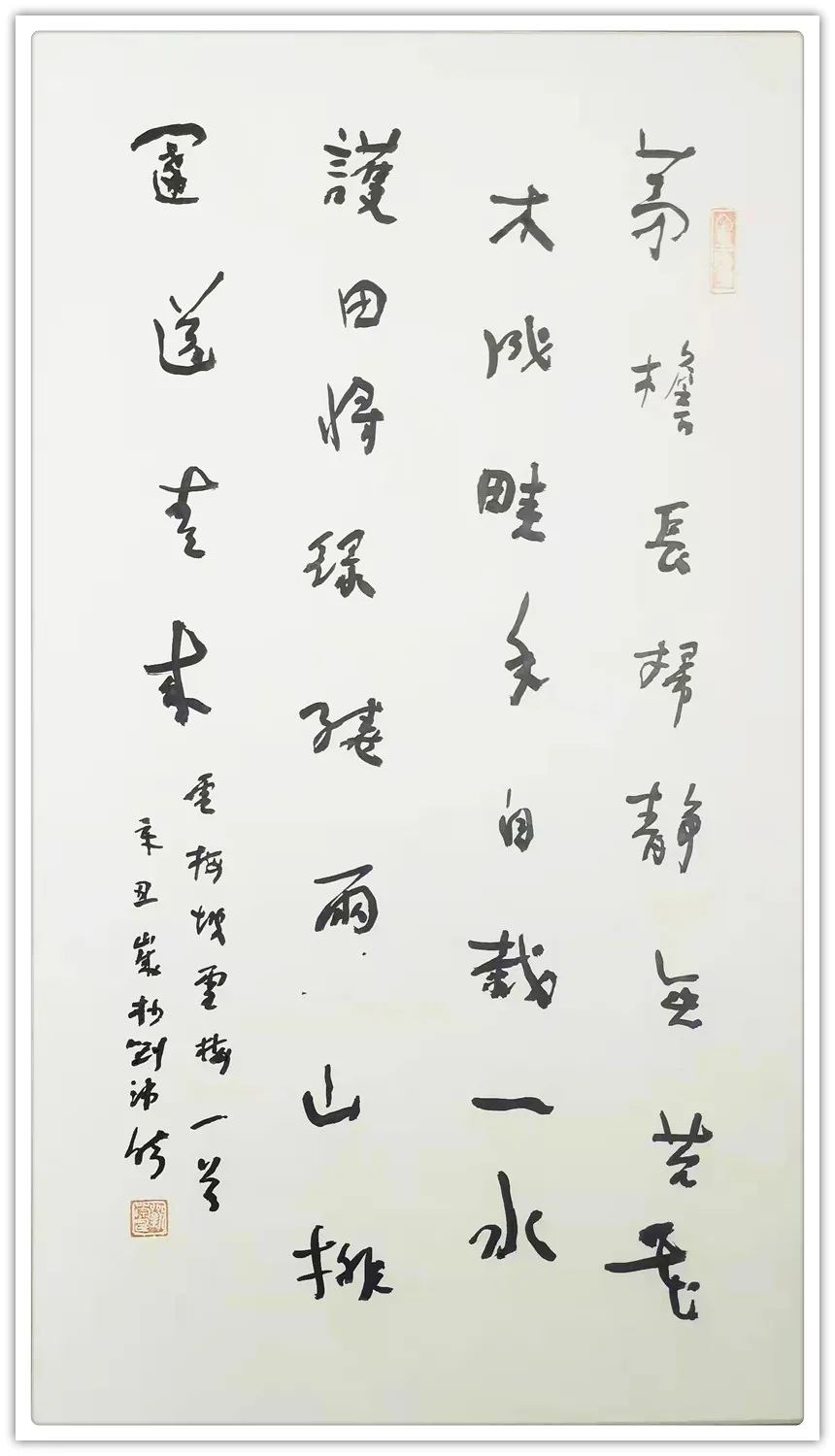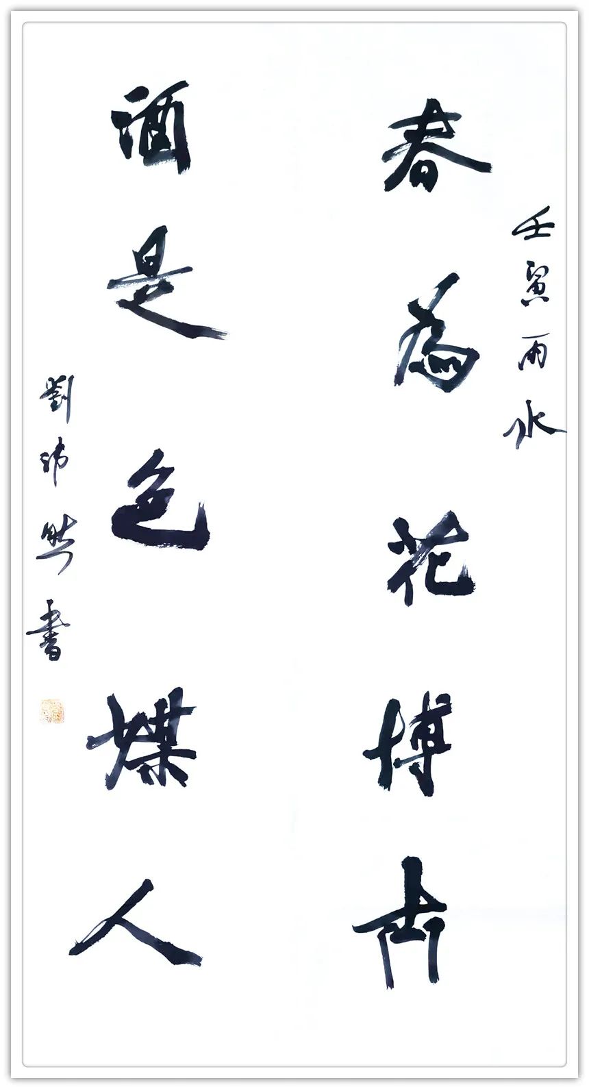 本质上,刻字、篆刻和书法都属手艺的范畴,都需要恒守的匠性和思变的匠心,这三者并不因为工具介质的不同而有所区别。所以,崇寿书法从表象看有结体章法依规依矩的匠性坚守,往里看却是点画使转自在方园的匠心飞扬。既有錾凿对木石以少变应多变的简率直接、雄强刚毅,更有毛笔和水墨在纸帛上“奇怪生焉”的曲折抖擞,姿态万端。在刻与写的互参互佐下,崇寿将刀笔亦偏亦正、长冲短切而成的险峻尖利,与毛笔若断若连、点画驻留生发的圆融冲和,通过如“锥画沙”如“屋漏痕〞的将柔就刚,以刚出柔,互联互通,互欹互正,营造出平面书法艺术的立体意境,赋予点画结体、文句章法的静止实形以文本的流动虚相,从而具有了中华文化阴阳和合的典型品质和表现。作为陈氏太极拳的十三代传人,崇寿书法讲究“松、沉、圆、活”。这四个字是太极拳诀也是崇寿书诀。就是说,书法跟太极一样,是在意识导引下的笔墨行为,亦如王羲之所称“笔是将军”。迟重基于谋定,谋定而后动,动则心态松,形态正,气息沉,依情势形势,收放圜转,意在笔先,笔随意走,因循自然,自然而然。其笔法、墨法、章法的刚柔、轻重、虚实、收放、进退、枯润等等充满两仪变易的况味。所以崇寿书法与刻字、拳法异工同曲。近来崇寿以飞白技法强化黑白形质,通过有意的少蘸墨,无意的不蘸墨,在墨余、笔收、气达的黑白虚实交互中笔止意留,陈虚布实,呈现出特别的笔力墨气,血性骨气,使黑白之间阴阳共生的面貌体现了书法笔墨法无定法,然后非法法也的书法文化性。