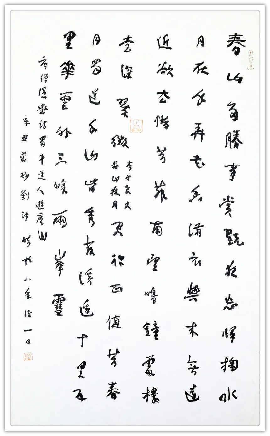 不可否认的是,崇寿书法基于形式审美的目的。或者说他在文化尊重基础上的自我必然性情和偶然感觉及其文字文本外在形式的表达,重于文本内容信息的传达本身。但是,与那些借书法笔墨的表现形式来表现自我的书法行为,或将书法行为的过程作为目的的行为书法不同,也与“当代”书法强调笔墨行为而不论笔墨何为有别,亦与传统书法强调内敛、中庸、平和有异,崇寿书法虽然是传统舞蹈,却因为更在意此时、此地、此情、此境的心与手合,其笔墨往往多了些艺术传统的意料之外,却不违传统文化和当代艺术的情理之中。