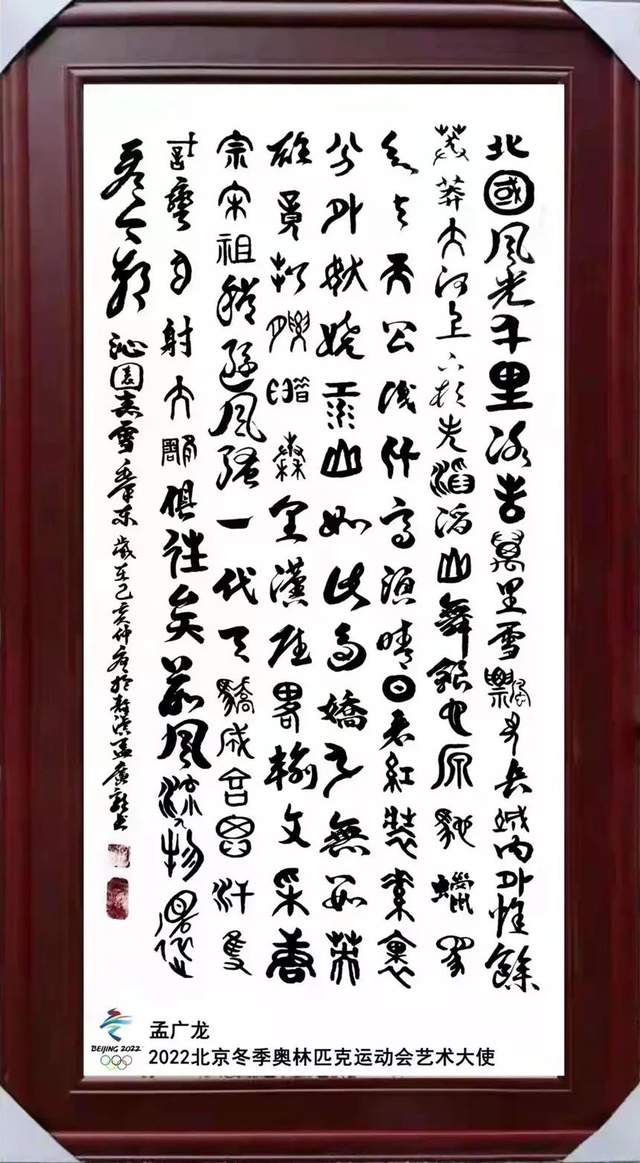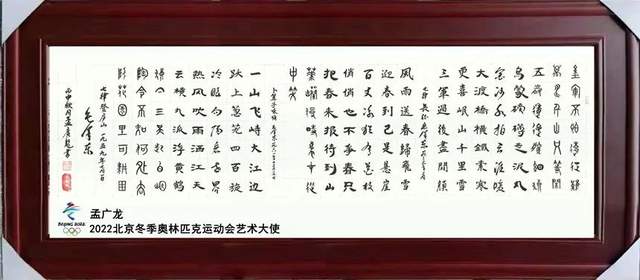 荣誉经历: 2013年12月获“第二届全国少先大队辅导员书画作品征集展示”优秀奖。2014年6月在“红高粱杯”书画篆刻大赛(首届)中荣获银奖。2014年10月荣获首届“金吴针杯”全国书画大赛入展奖。2014年12月荣获首届“翰墨九州”全国书画大赛提名奖。2014获 《民族魂•中国梦》“德艺双馨杯”书画作品展中书法三等奖杯及证书。2015年3月经百家媒体共同推选为《特邀最受欢迎的人民书画家献礼全国两会》媒体特展。2016年被邀“书画界新闻人物献礼全国两会” “聚焦书画传奇人物系列推荐” “深入生活扎根人民优秀人民书画家成果展”。2017 年12月,孟广龙老师现身中央电视台,全程参与2017年特别节目《温暖2017》录制并与中央电视台著名主持人朱军合影留念。2018年5月在第十八届世纪大采风总结表彰大会暨CCTV年度人物盛典中,被评为“中国当代最具特色书画家” “中国书画传承艺术名家”。2019年3月中国世纪大采风书画院授予孟广龙中国世纪大采风书画院副院长称号。2019年11月 参加由韩国书画协会举办的“墨香之约魅力中国一一中韩文化艺术交流大会”并授予“中韩两国文化交流大使”荣誉称号。2019年11月 其作品在CCTV国宝档案书画栏目组作为书画国宝典范进行记录归档。2020年一月 在湖南卫视春节联欢晚会中荣获“最佳明星奖”。2020年4月参加全国书画网络精品展《大美中国 大美书画》并授予“新时代优秀书画家"。2022年是北京冬奥会艺术大使。