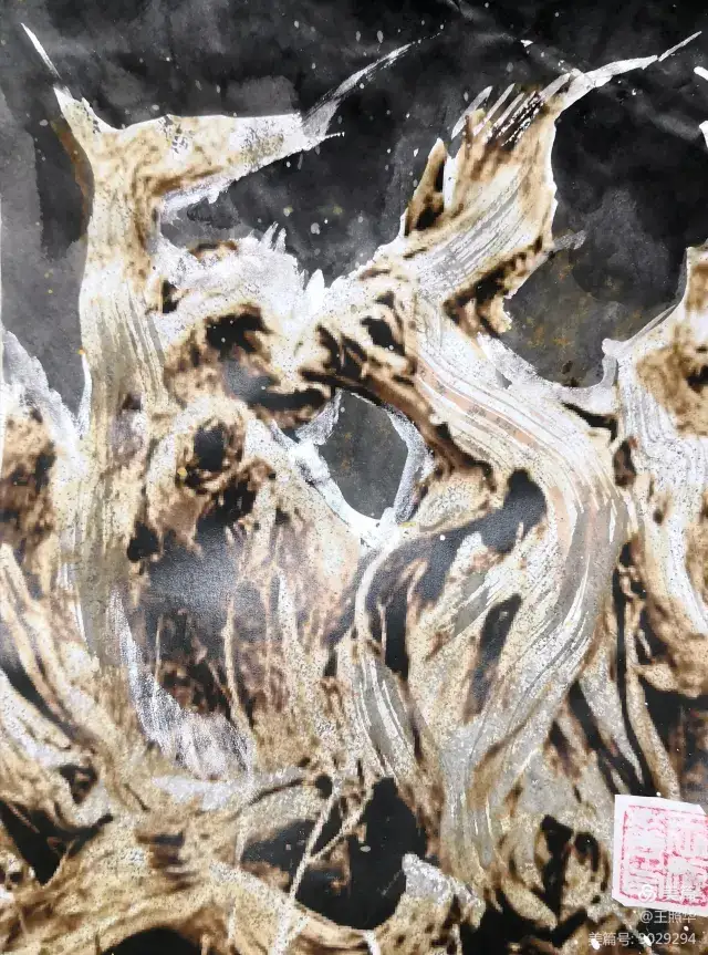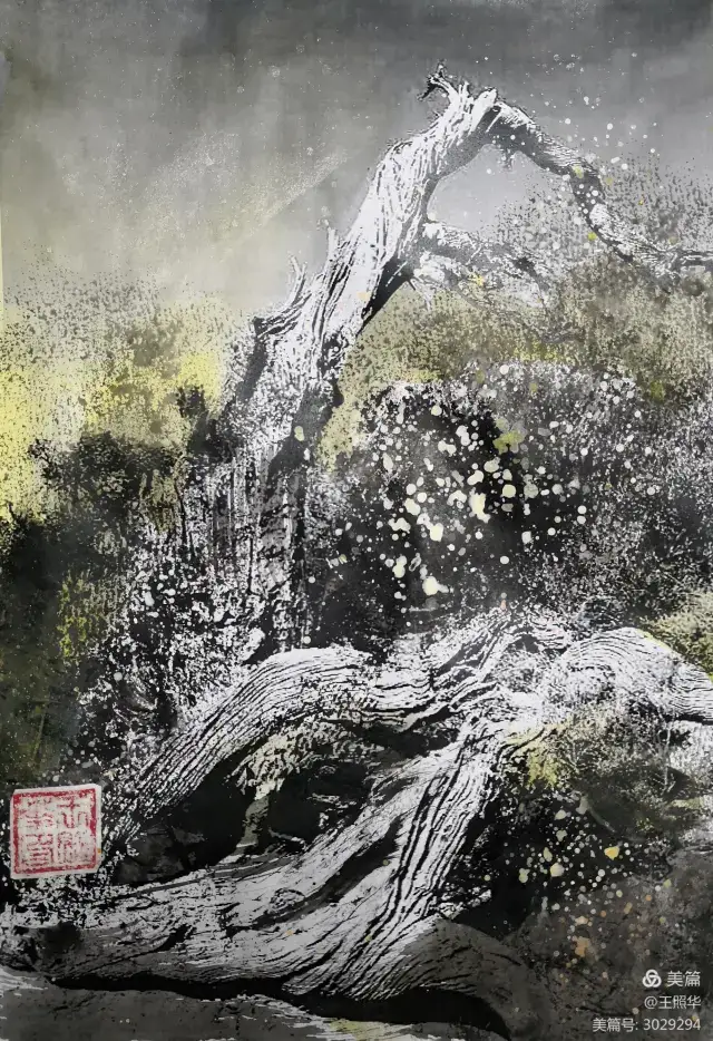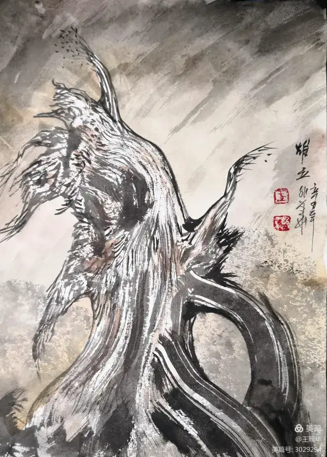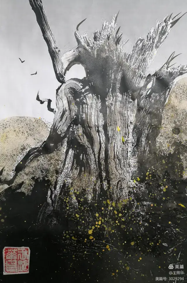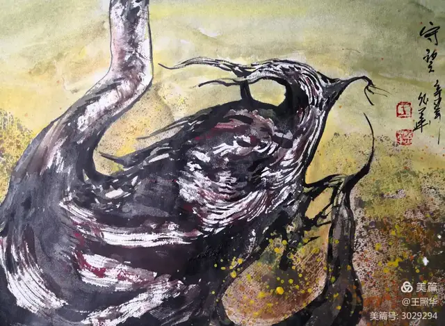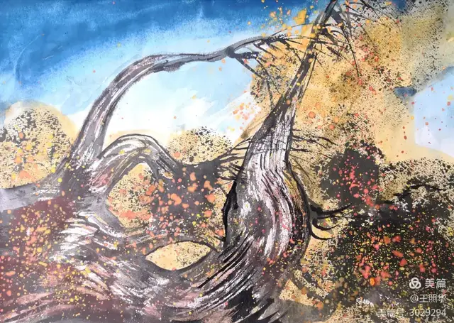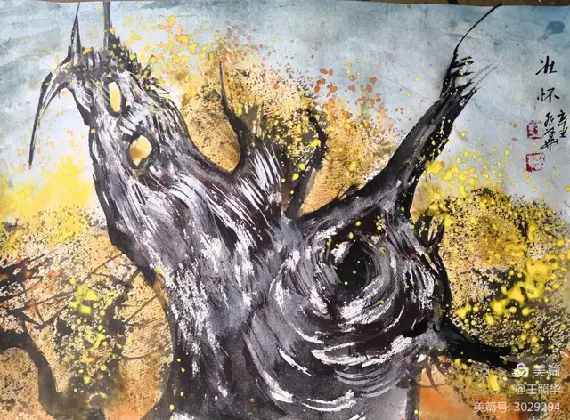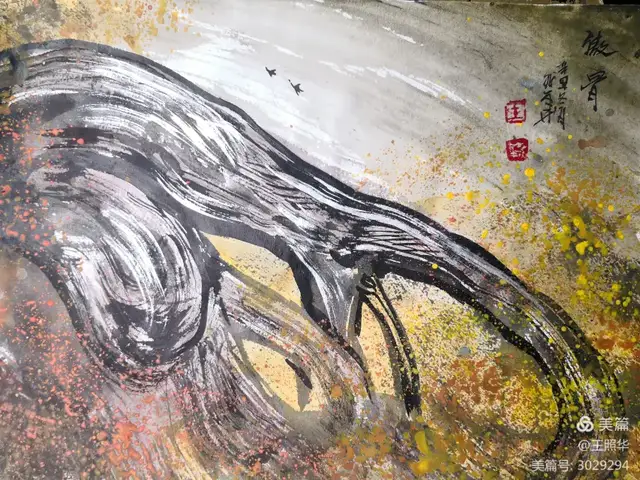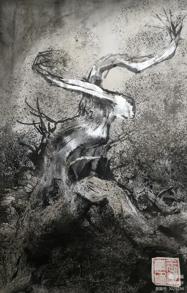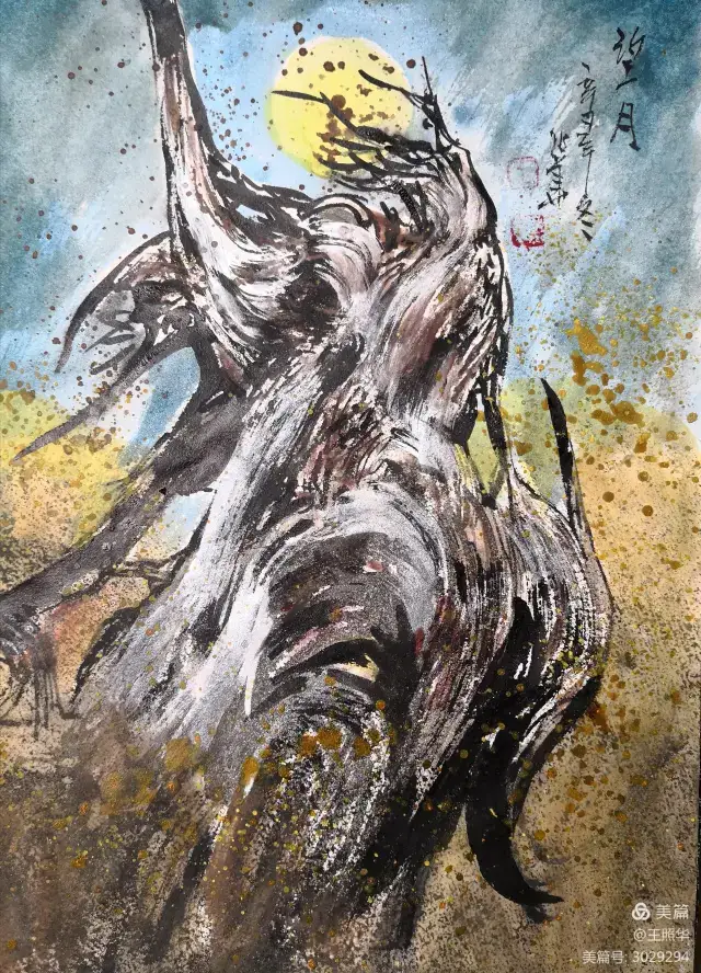 王照华老师的胡杨画由目视到心视,画里有胡杨,胡杨画中有胡杨精神,用笔墨唱响了一支对胡杨精神的颂歌。画家王照华以笔墨功夫和精神气质互为表里,通过基本功的磨砺呈现出的笔墨结构之美,通过蒙养人格等修炼笔墨结构承载的精神力量从而达到“物我两忘、天人合一”。。好的笔墨结构有骨、肉、血,同时也承载着画家的精、气、神。