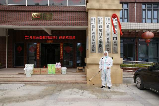 图:志愿者在前尾村敬老院进行喷雾器消杀