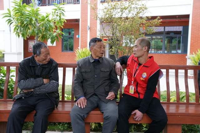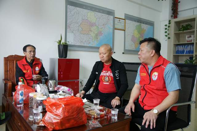 图:泉州市慈善一家亲助困协会执行会长丁荣春(右)与前尾村敬老院院长姚庆源(中)研讨老年人服务工作