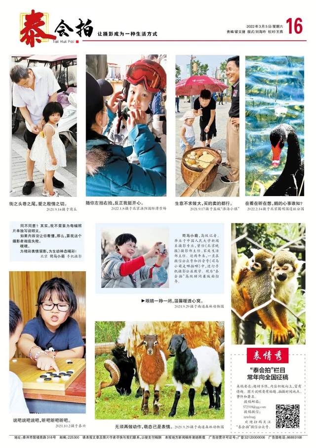 昨天《泰州晚报》的“泰会拍”摄影版,是我的摄影课堂《表情秀》。虽然用手机抓拍瞬间,比用相机困难得多,但並非不可能。七张照片摄于南通、盐城、商丘、泰兴、北京圆明园、平谷滑雪场,希望暖到你!——司马小萌
