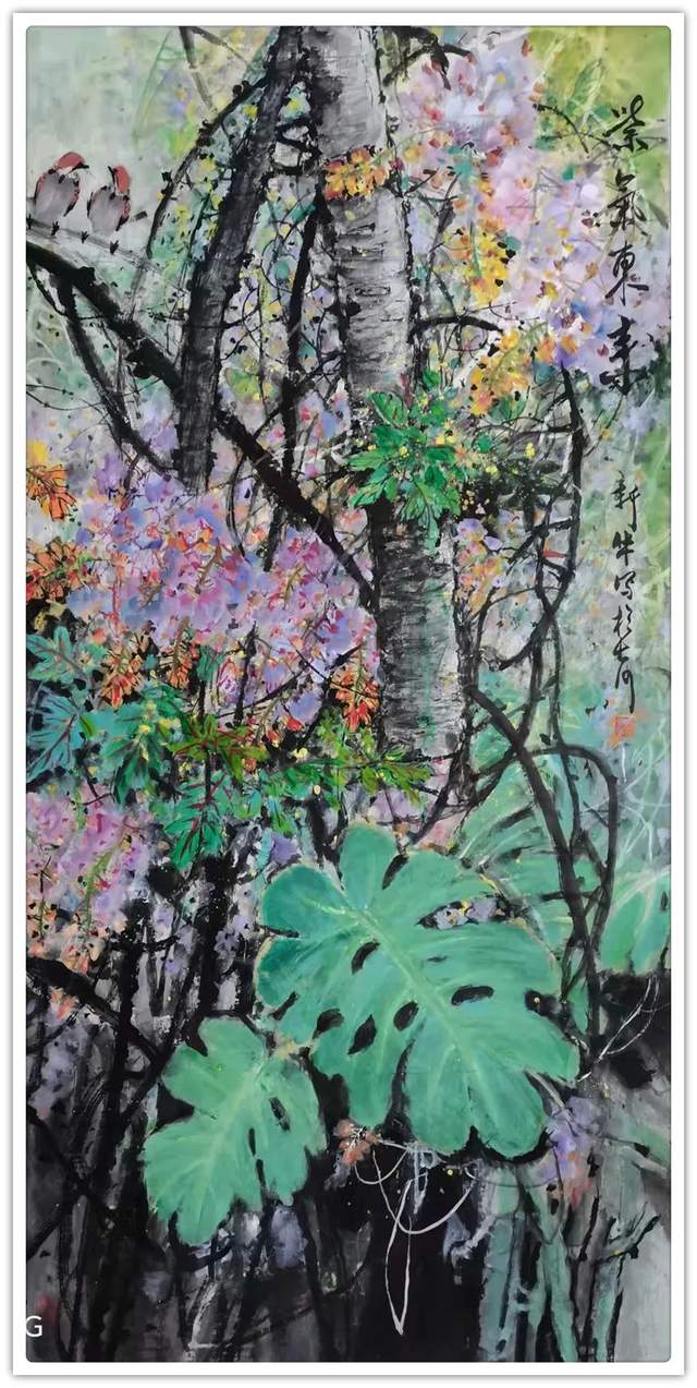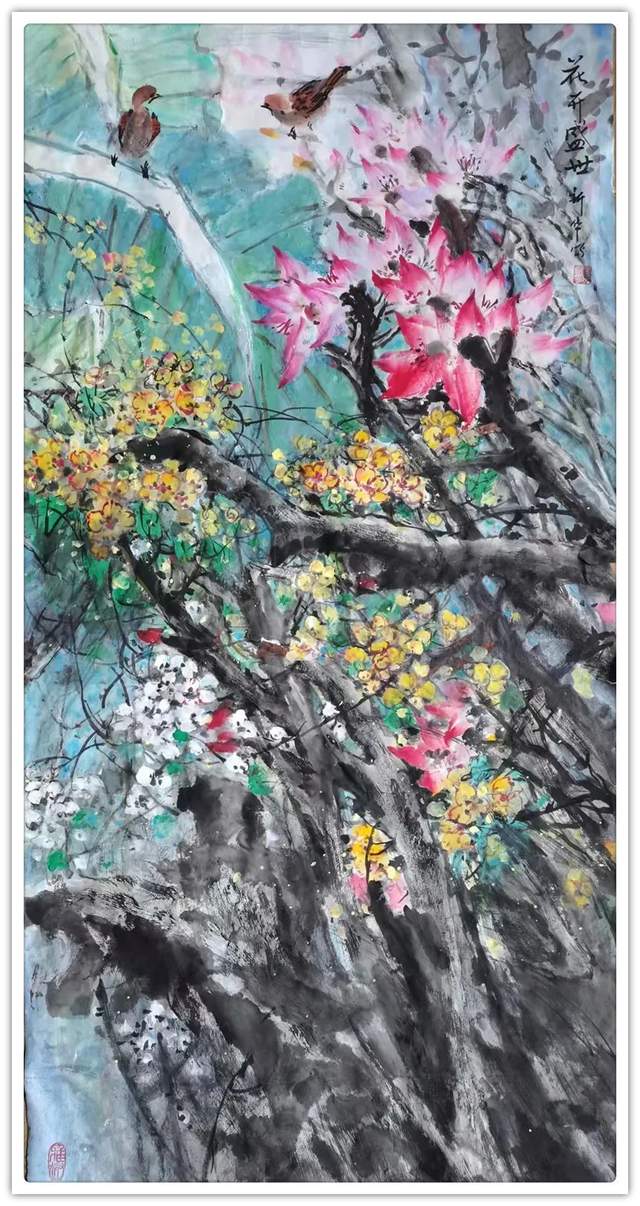 易女士能从生活中获取灵感,她基于传统,又重视于画外功夫,多方的艺术修养为其花鸟作品呈现出了有深度的意境。与此同时,易女士又能够很好地抓住世人的视觉审美,所以她所创作的花鸟题材基本都很受人们喜爱。纵赏易女士的众幅花鸟作品,其作品重点一笔一墨都皆具想法,虽为写意,但却细腻,整个笔墨是与作品的整体构思达成了一致,笔法轻重急缓各得其所,墨法浓淡干湿各显其妙,花筋花叶,于工中有写,于写中有工,朵朵花卉有的是百花争艳,有的是少女姣姿,更有的是似亭亭玉立的舞女,婀娜多姿,眉目传情!