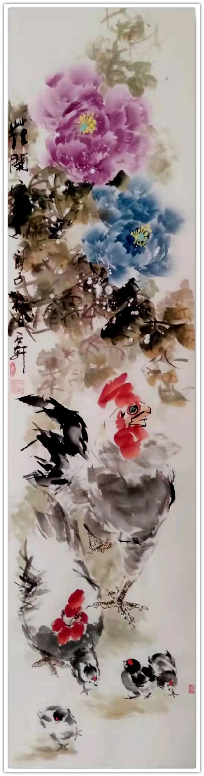 民族魂,取材于洛川传统舞蹈蹩鼓,国家级非物质文化遗产之一。洛川蹩鼓主要流传于陕西省洛川县言称蹦跳为蹩,此舞以蹦跳为特征,故称蹩鼓。洛川蹩鼓最大的特点是在蹦跳中完成各种舞蹈动作在锣鼓齐鸣中左冲右扑,拼杀搏斗,如临战阵,动作粗犷,剽悍豪放。作者用水粉画的表现方法与汹涌彭拜的黄河融画在一块,画面大气磅礴充分表现出我们中华民族厚德载物自强不息的民族气概!发表于《当代陕西》他创作的《果实累累》、《花开富贵》、《暗香浮动》等国画作品,色彩斑斓,布局饱满,给人以清新自然、古朴广博、新颖灵动的感觉。观郭石轩老师的国画作品,不但画的题材宽广,花鸟,动物,山水草木等均有涉猎,并下笔如有神助;而且其画风纯正,心随笔运,神思迭出,不落窠臼,毫无刻板、呆滞之感,整体画面给人干净利落的视觉享受。更进一步说,从画理上,他也摆脱了形的纠缠,已达到形而上的境界。因之,他的画作中,屡见巧拙相参,拙而能巧,时出奇趣,峰回路转之佳品。如《大吉图》、《富贵吉祥》、《锦上添花》、《鹰击长空》、《寿比南山》、《风光不与四季同》等作品,构思奇绝,灵气十足,神韵俱备,令人观之无不心旷神怡。在简练的笔墨、造型、设色中,将一个个动物的神态,一枝枝花草的神韵表现得淋漓尽致,足使雅俗共赏,先睹为快。“画到精神飘没处,已无真相有真魂”,历代书画前贤的艺术理念在郭石轩老师的头脑中已深深扎根,必然使得他洒脱老道的画笔下将呈现出更多更美的优秀作品。