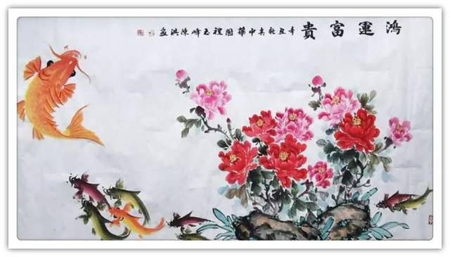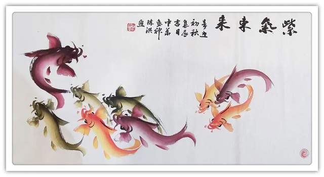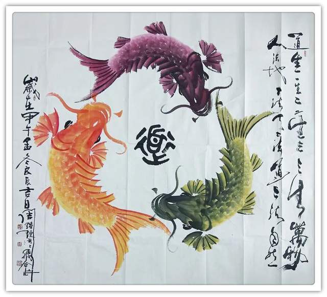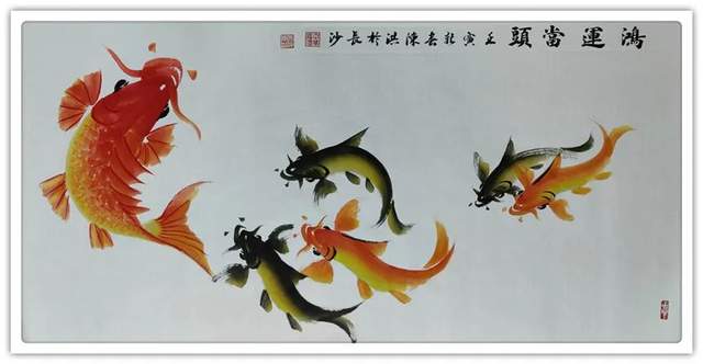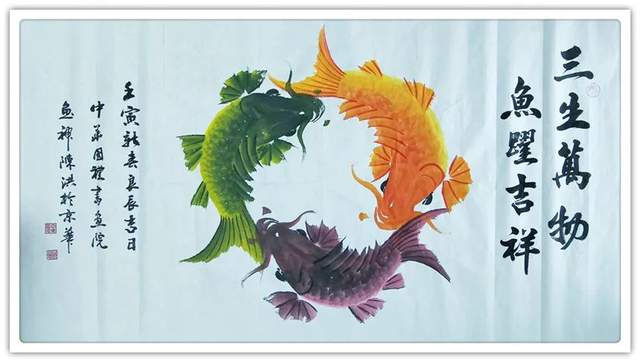 再者,他的鱼题作品,深受百姓喜欢。家家屏障可装饰,家有鱼画,风生水起,时来运转!红鱼吉寓家财,黑鱼则谙外财,两财皆有来路,风水作见证,家家渡吉祥。群鱼翔于波涛间,吉寓多子、称许龙门也是喜人心怀,最有雅俗共赏的魅力。所以他的鱼画作品,上可以藏庙堂,下可以悦百姓,无比宽博的欣赏受众,让他成为一代中华鱼神,实属功到自然成!画鱼国手,为艺术赢得了文化自信,为中国塑造了盛世形象。所以论他的鱼题作品是谓艺术的弘钟大吕,实属名副其实!