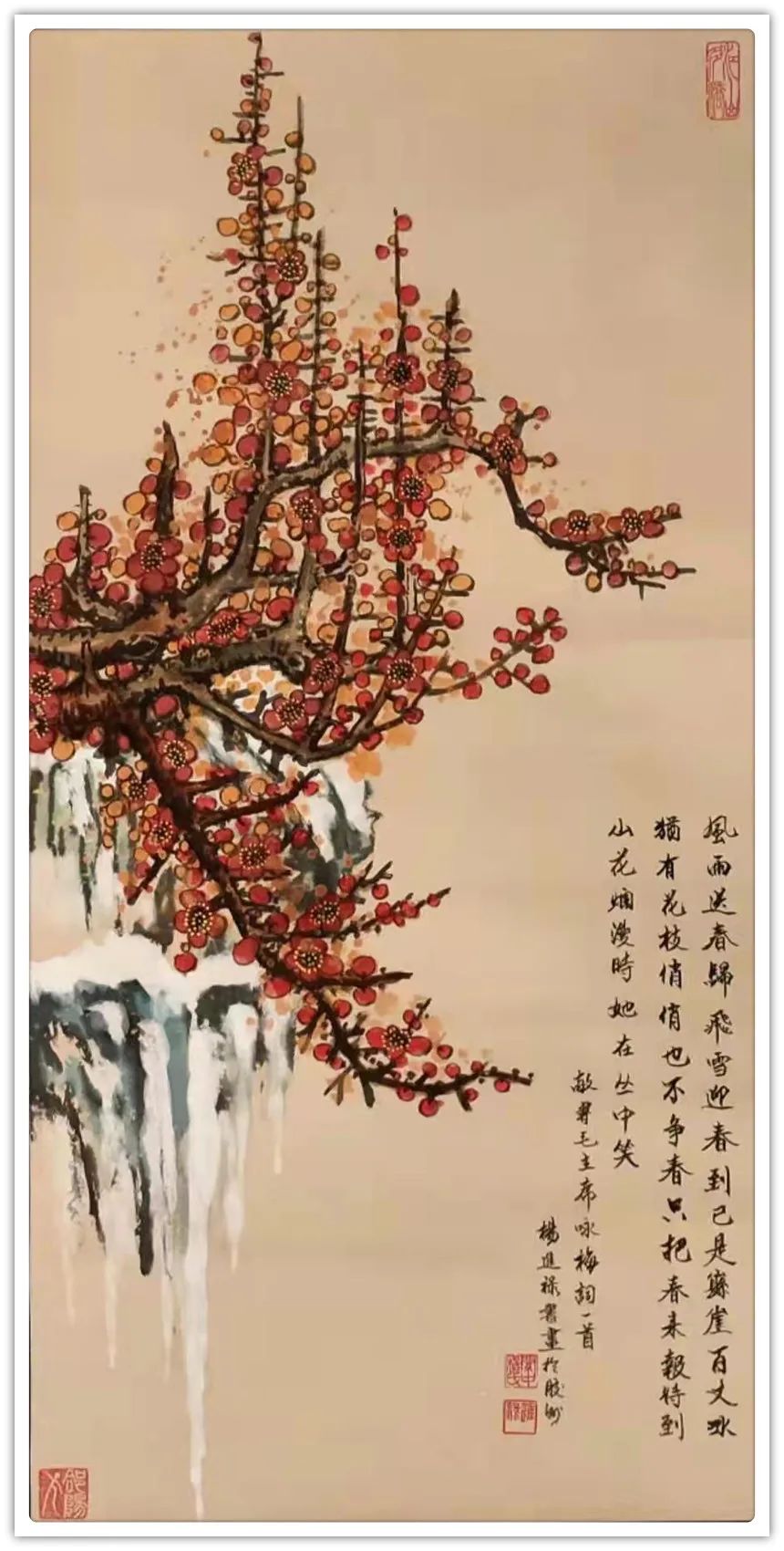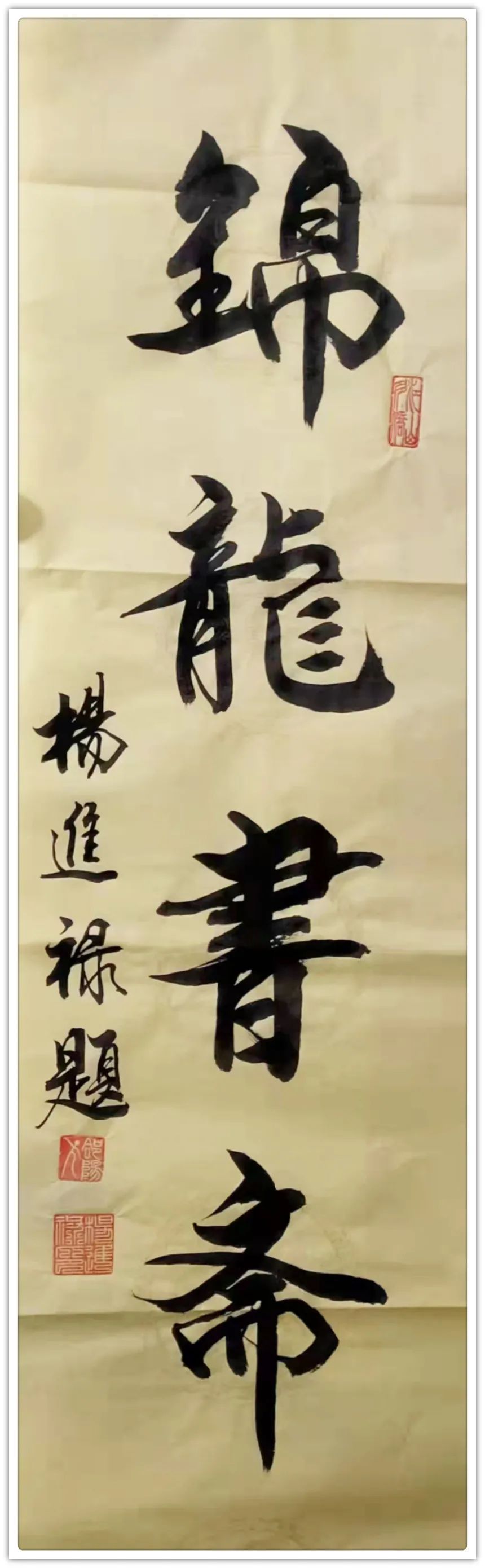杨进禄:生于1945年,陕西合阳人,国家特级书法师,国家一级美术师,中国美术家协会会员,中国书法家协会会员,当代著名的书画大师和世界文化名人 。他对书法和绘画均有极高的造诣,对当代艺术发展具有重要的贡献,被业界称为“书画双绝”。他的书法,楷 、草、隶、篆均有造诣,以隶为重,能写出七种变化。杨进禄作品代表作有《祖国万岁》《福·寿·康·宁》《沁园春雪》。《福·寿·康·宁》以楷、草、隶、篆四种字体书写,受国家知识产权保护。《沁园春雪》在2014年十一月搭载航天飞行器“小飞”遨游太空。