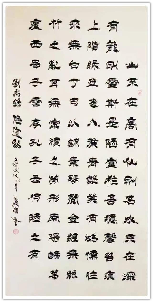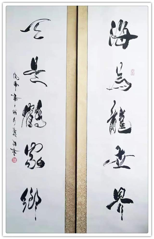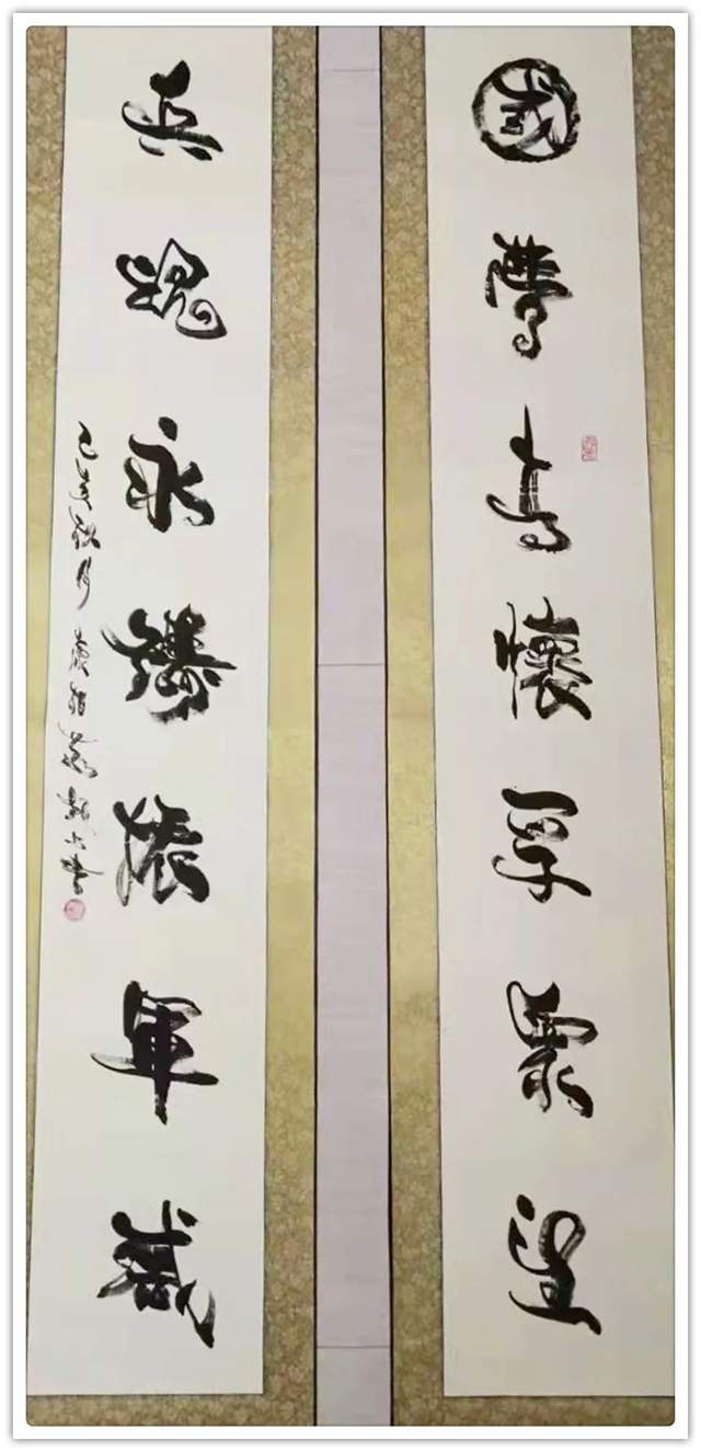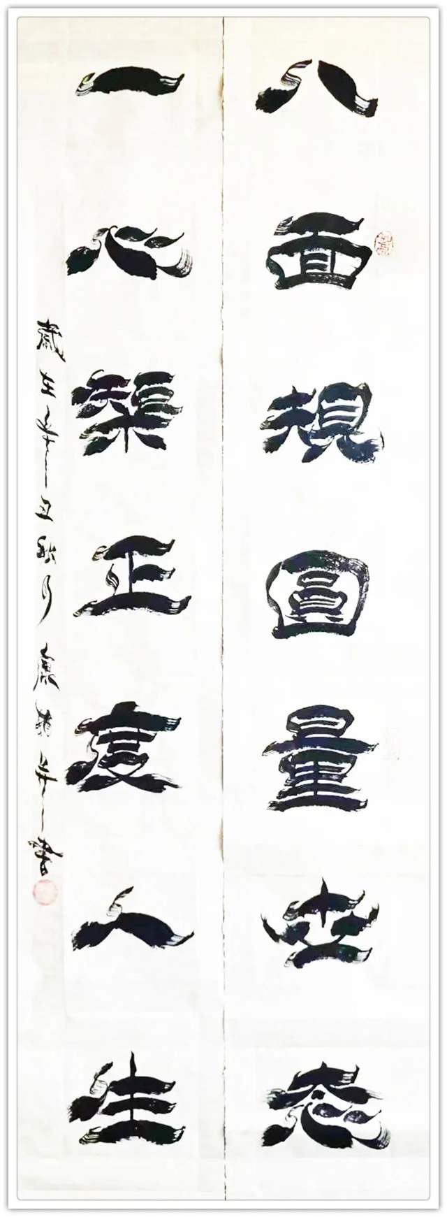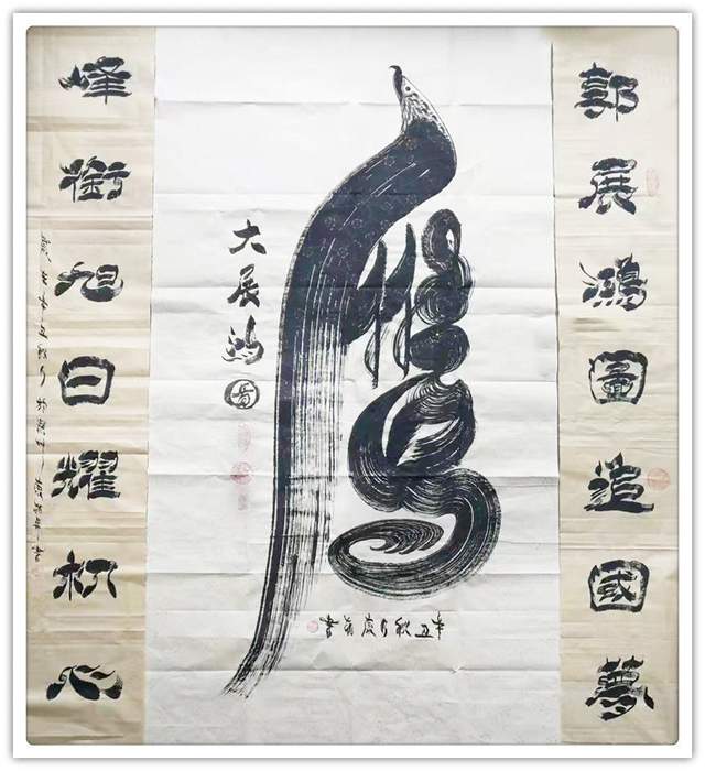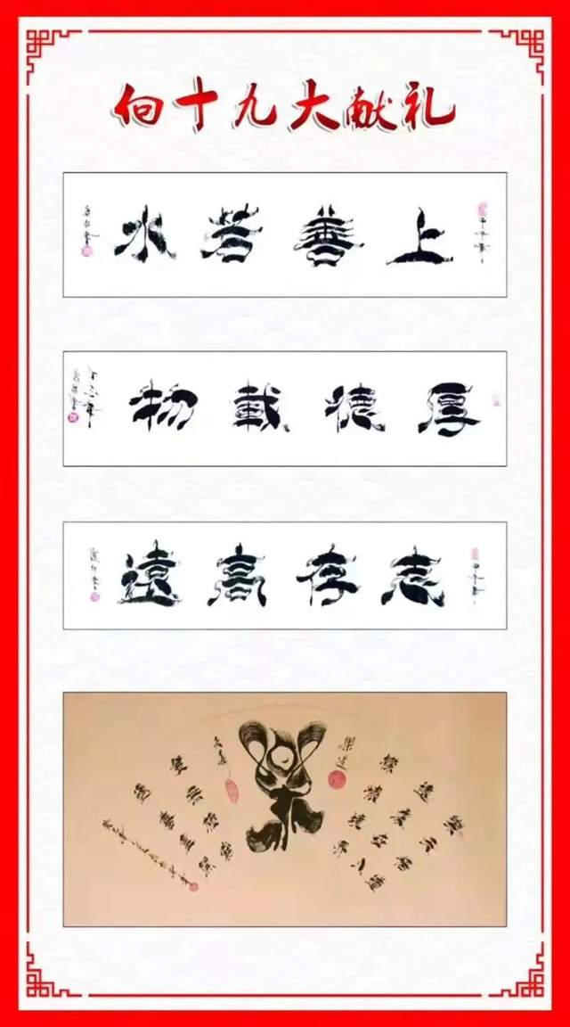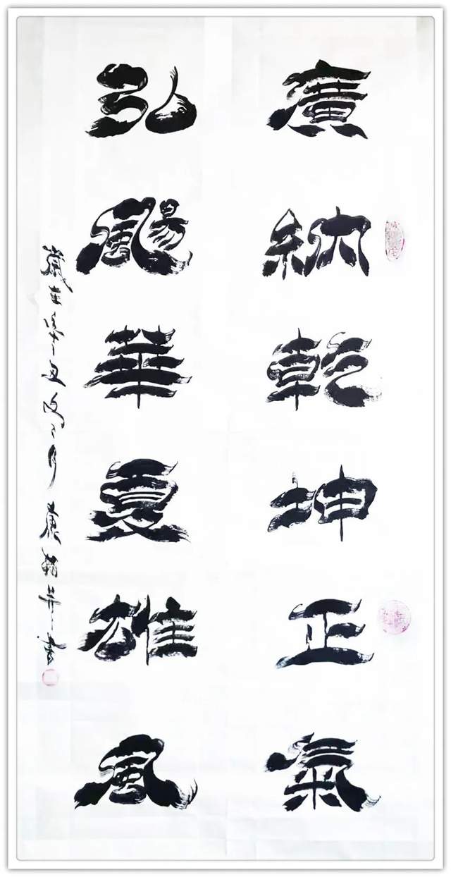独创性艺术作品有:左跃式梅花格薄笔行草书和横大行写隶书,形象书法有《大展宏图<鹰>字》、《鹤舞》、《乐》、 《好》、《出污坭而不染》、《忍》等艺术作品得到社会各界的高度赞誉和好评。作品在国内外,香港、台湾、新,马、泰、韩国、法国、美国纽约<联合国成立70周年展>等。多幅作品被数家著名艺术机构刊载出版发行和永久收藏。