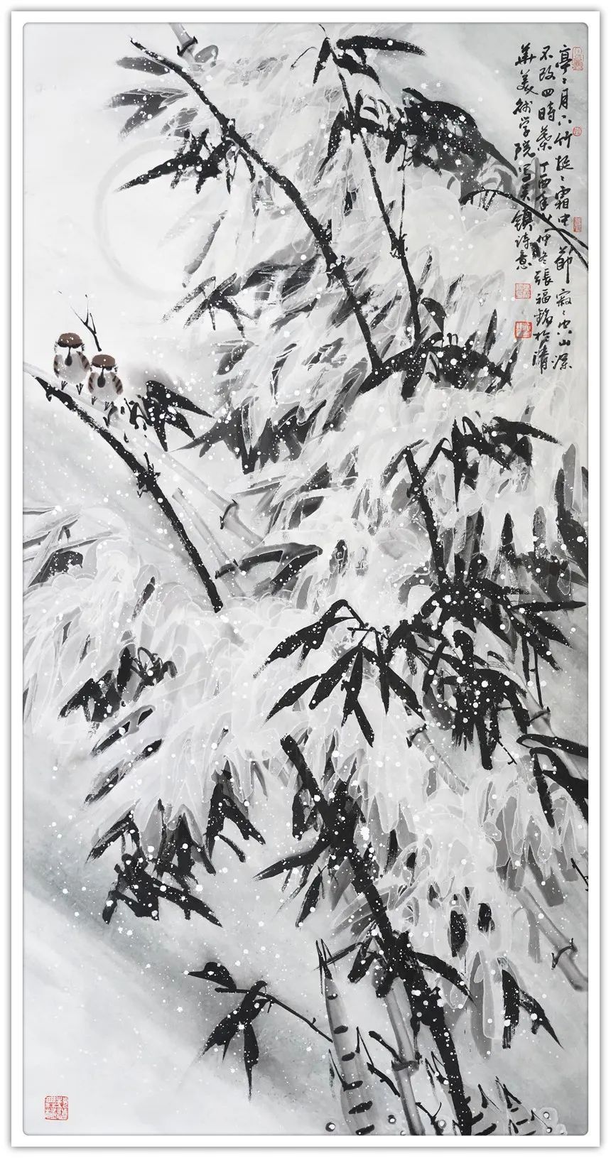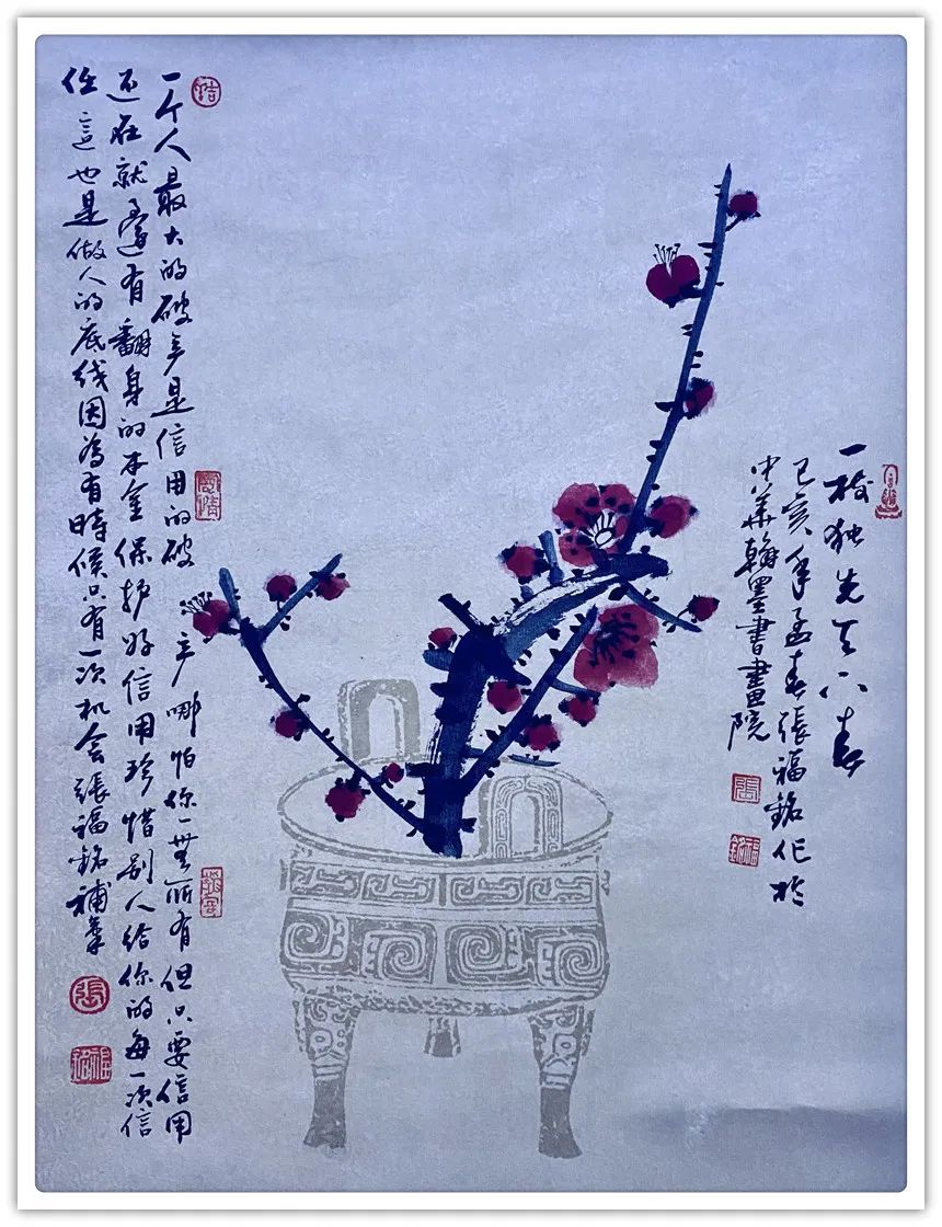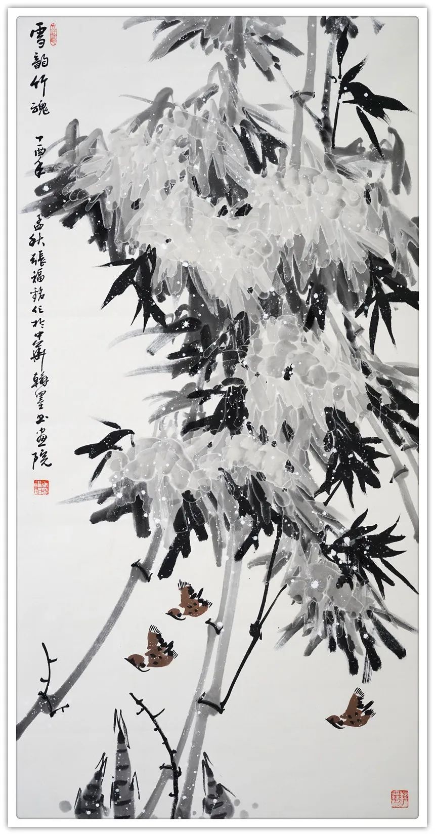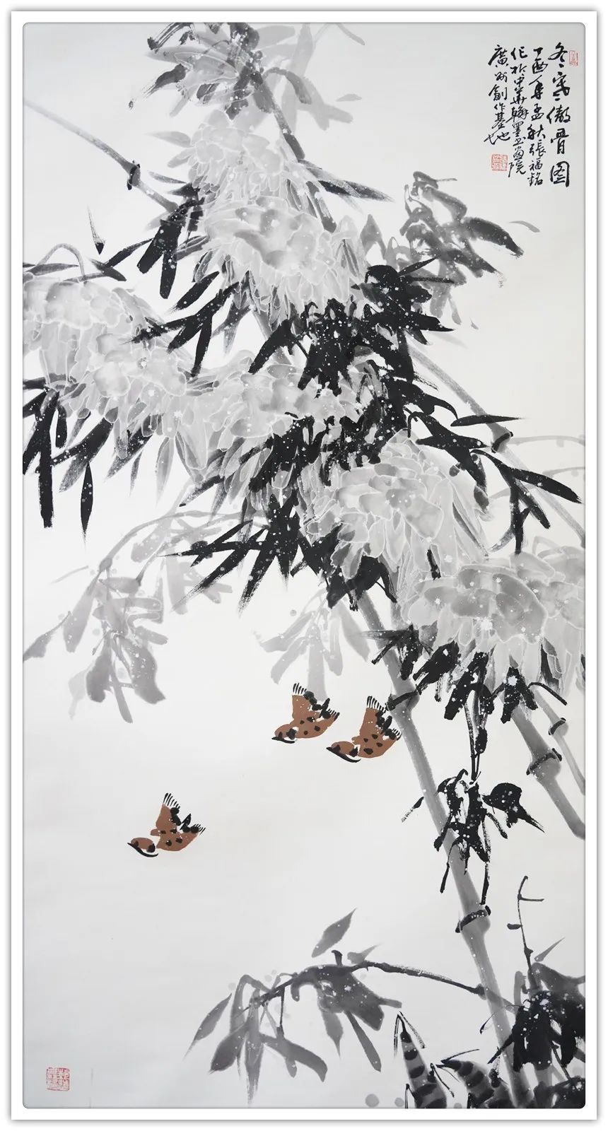 仔细梳理张福铭先生的艺术生涯与发展轨迹,将其归为军旅画家未为不可。他有着长期扎根军营的人生阅历与生活体验,这锤炼了他一种坚韧不拔、傲然独立的性格与精神。因此才使得我们能够观赏到其作品中大量描绘凌风傲骨、雪竹摇曳、苍松立雪、梅花怒放等画境,这显然是具有明显积极寓意之象征性作品。与此同时,张福铭的作品虽取材于传统花鸟题材,但技法却极具个人风貌与独特探索精神。这与其常年坚持不懈严格以一位优秀军人,优秀书法家的标准要求自己是分不开的。回望画史,优秀的中国画家尤其花鸟画家往往都是成绩不凡的书法家,张福铭显然极为明了其中三昧,因而才使我们感受到其作品中不俗的笔墨情韵。上述因素使得其用笔厚重而不凝滞,温润而不轻浮、细腻而不琐碎,章法布局、行笔构图亦多考量所绘题材之典型寓意而极富变化感。