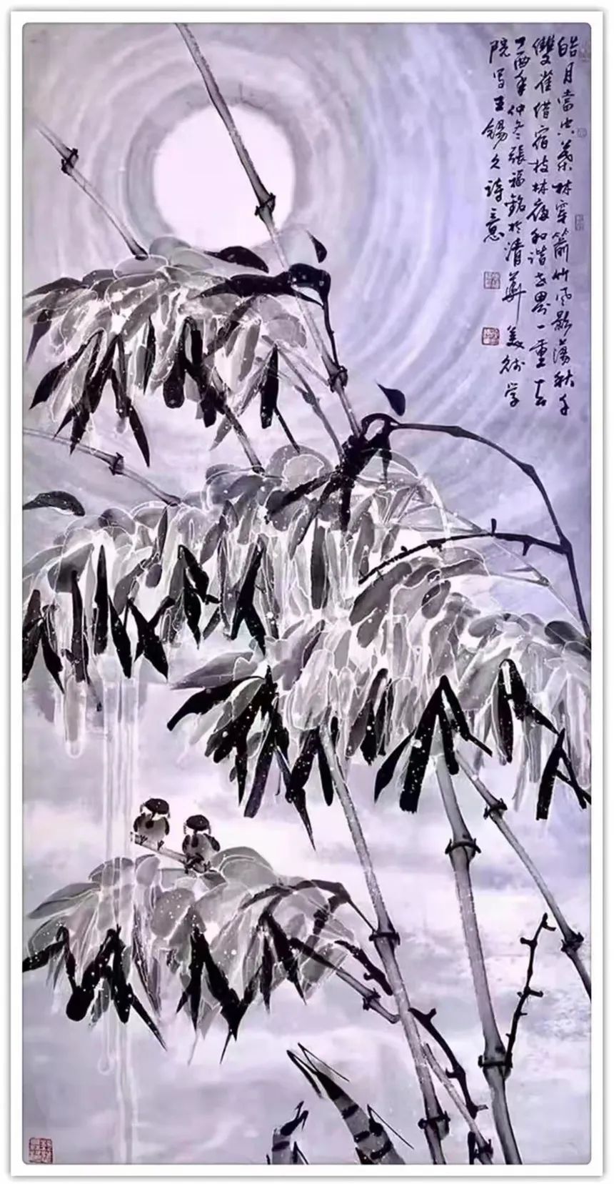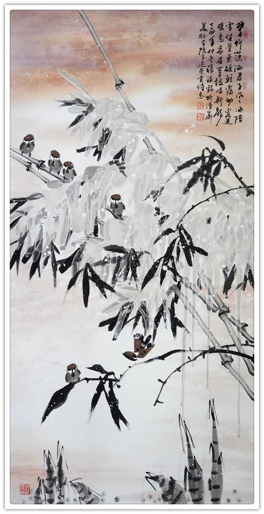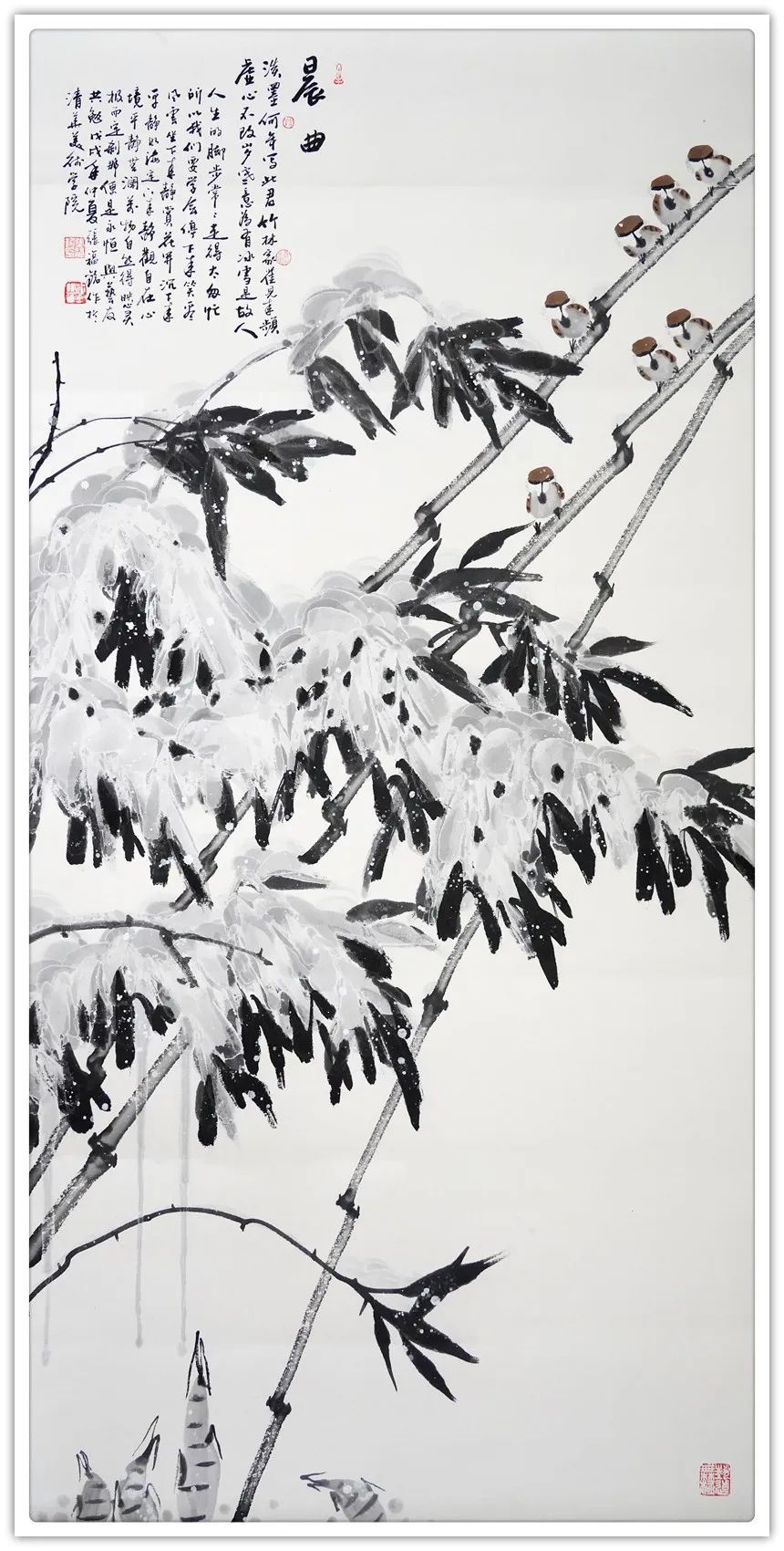 仔细梳理张福铭先生的艺术生涯与发展轨迹,将其归为军旅画家未为不可。他有着长期扎根军营的人生阅历与生活体验,这锤炼了他一种坚韧不拔、傲然独立的性格与精神。因此才使得我们能够观赏到其作品中大量描绘凌风傲骨、雪竹摇曳、苍松立雪、梅花怒放等画境,这显然是具有明显积极寓意之象征性作品。与此同时,张福铭的作品虽取材于传统花鸟题材,但技法却极具个人风貌与独特探索精神。这与其常年坚持不懈严格以一位优秀军人,优秀书法家的标准要求自己是分不开的。回望画史,优秀的中国画家尤其花鸟画家往往都是成绩不凡的书法家,张福铭显然极为明了其中三昧,因而才使我们感受到其作品中不俗的笔墨情韵。上述因素使得其用笔厚重而不凝滞,温润而不轻浮、细腻而不琐碎,章法布局、行笔构图亦多考量所绘题材之典型寓意而极富变化感。