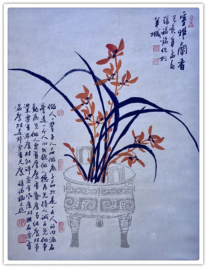 尤其需要引起我们重视,也特别值得我们着重提及的,还在于张福铭小写意花鸟画之所以呈现出一种独属于其个人的,极具典型文人审美意趣的书写韵味,恰恰是由于张福铭在经历了丰富人生体验之后,以一种澄怀味象的文人书法家之心境思索考量花鸟创作,进而呈现出其深厚笔墨积淀与传统功力。因此,使得欣赏者在细心感受其作品之时能够体味到一种书画一体、自然天成之妙趣。