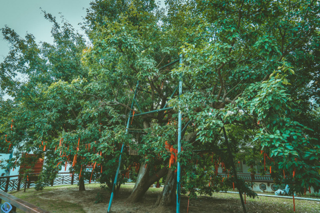 在这座“红豆村”里有一处并不太大,但被设计得非常精致的院落,生长着两棵硕大的红豆树,冠盖如云,荫及全院,树上挂满了寄托着无数青年男女浪漫情思的红布条,应该说,这棵树龄高达1400多年大树,是一株承载着物质与精神双重文化遗产的恒绿常青树,属于世界级的“爱情活化石”,无论是作为比较稀有的植物,或者作为特别典型的文学符号,还是作为爱情表达的信物象征,它都有着极高的美学研究价值和崇尚精神意义。