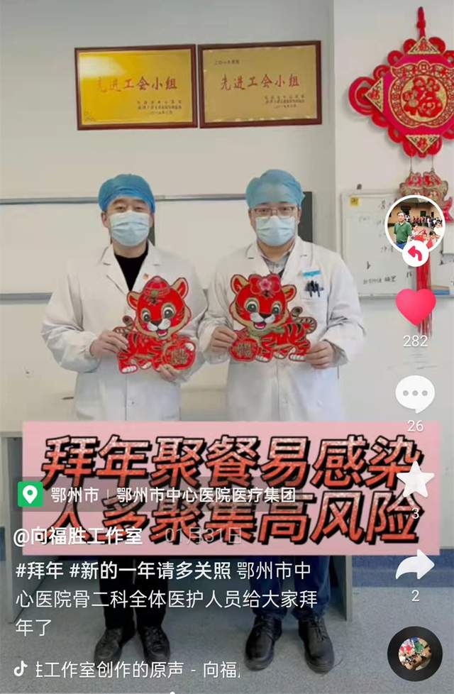 他们是医生,是护士,也是爸爸和妈妈。面对疫情,鄂州市中心医院骨二科的医生护士们勇敢前行防疫期间,科室全体医生、护士及护工人员坚守岗位,毫不懈怠,做好各项工作。向福胜与科室医生和护士变身“宣传员”,他们战斗在一线,春节也不忘记利用抖音小视频给市民拜年,同时为群众宣传新冠肺炎疫情防范知识,提醒市民朋友讲卫生,勤洗手,不让病毒身上留; 戴口罩,遮鼻口,个人防护记在心头。