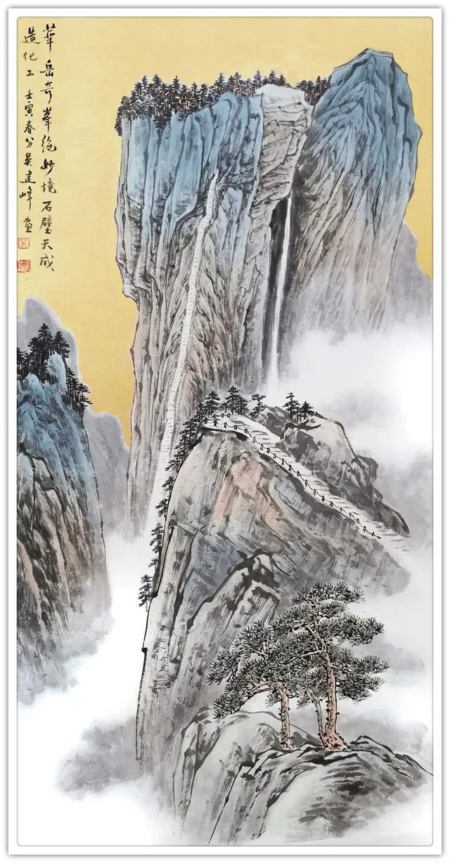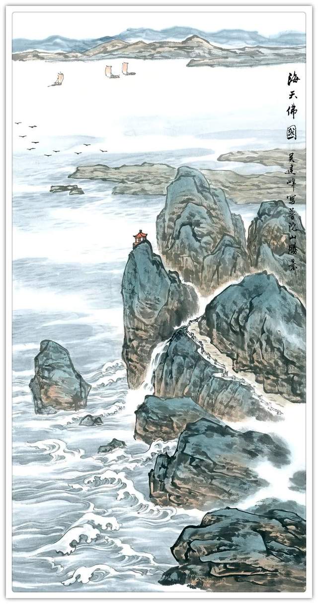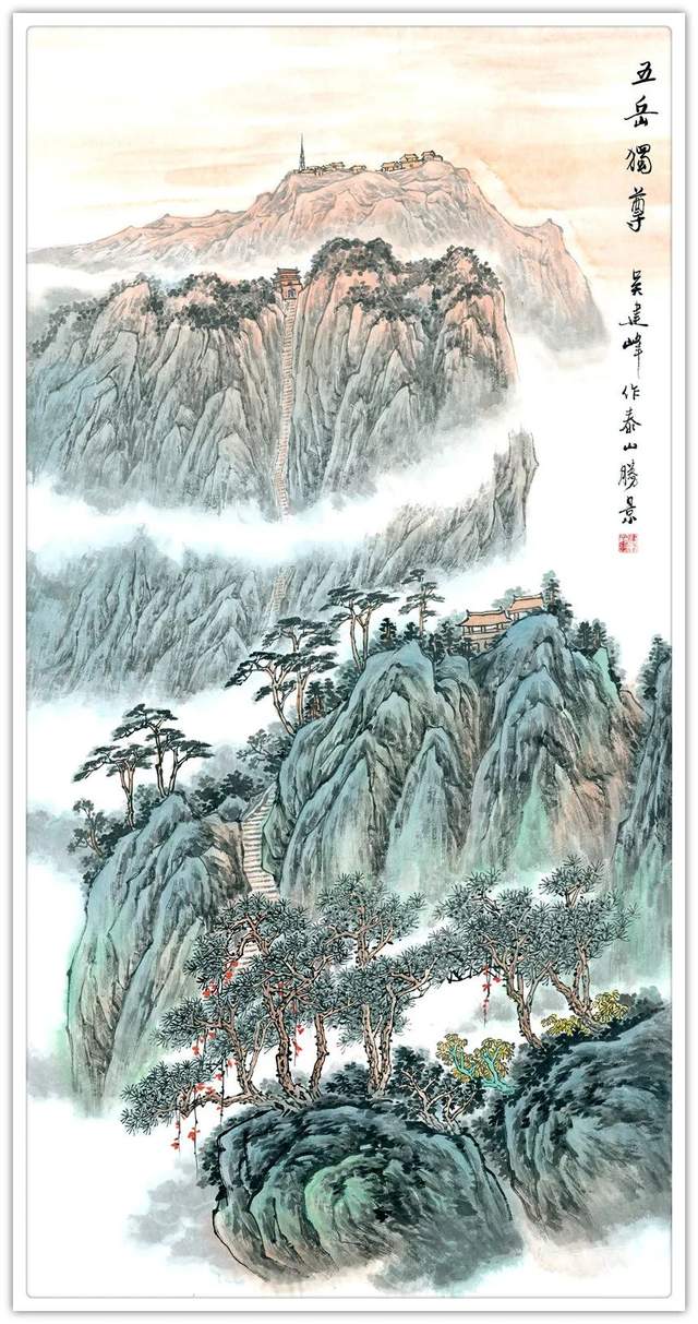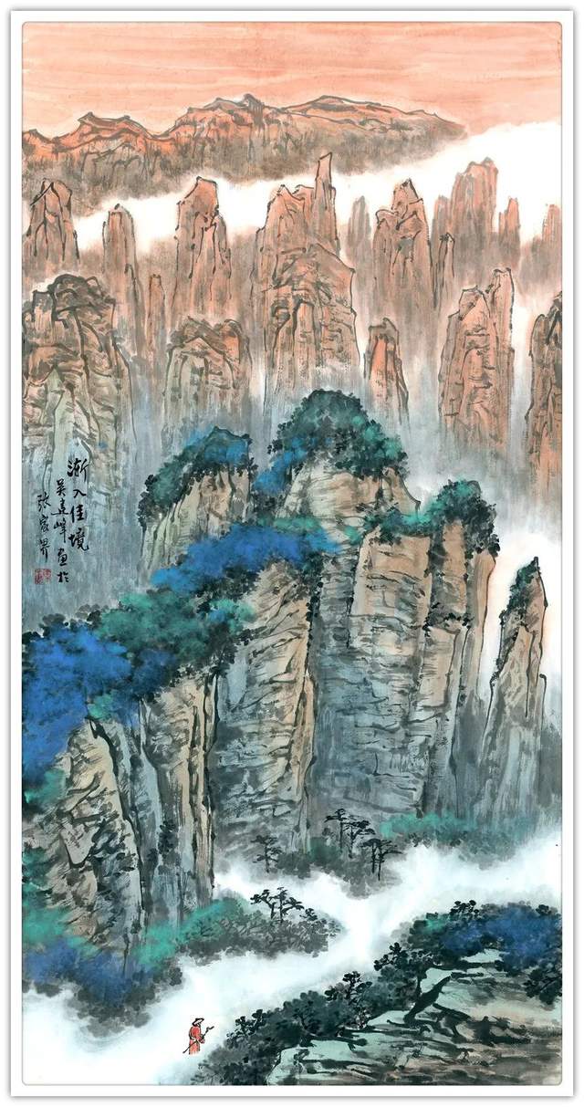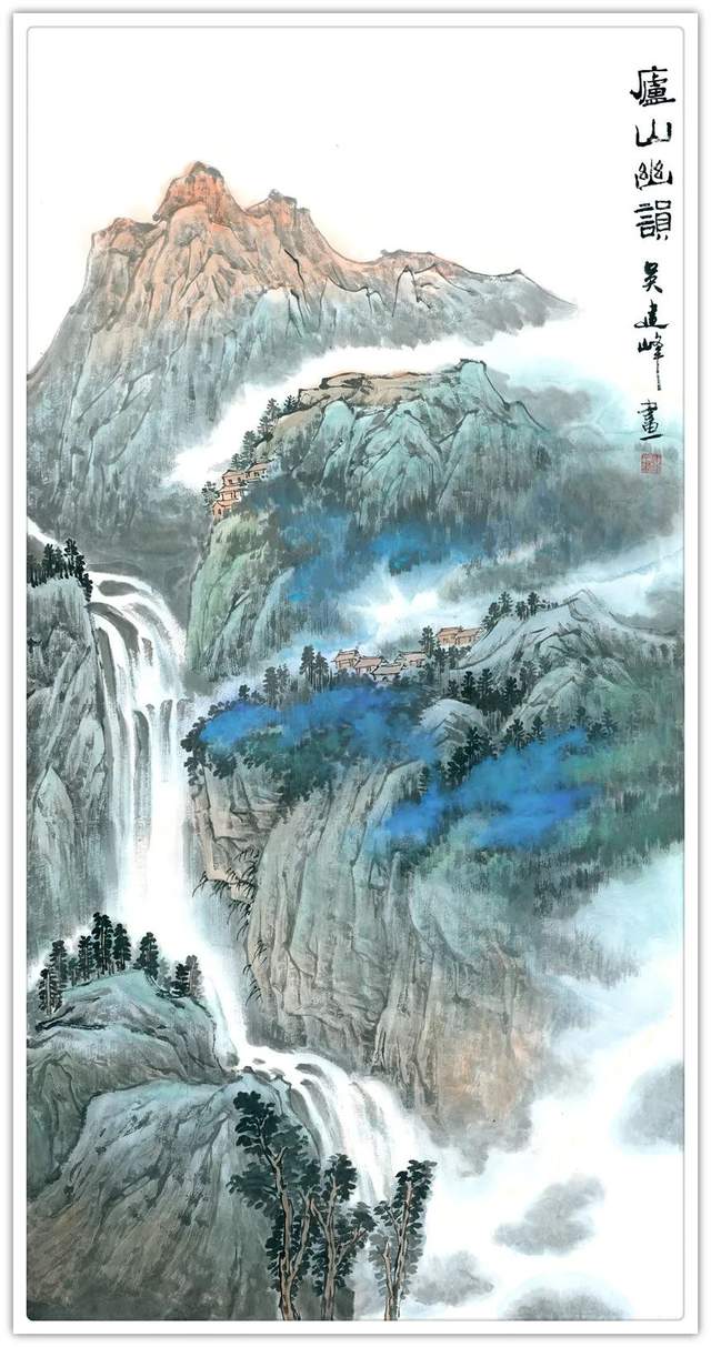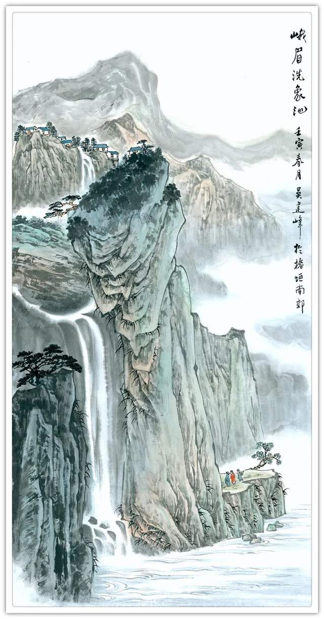 山水是国人的不变宗教,青绿乃文人走过的底色。峨眉山、庐山、雁荡山、普陀山、张家界、泰山、长白山……建峰兄以其丈量过的山骨水韵,描摹意境背后的故事人文,追踪笔墨内蕴的情绪节奏,色浓郁而气清新,形恢弘且韵明净,把古老青绿与海派画风作了交相呼应。