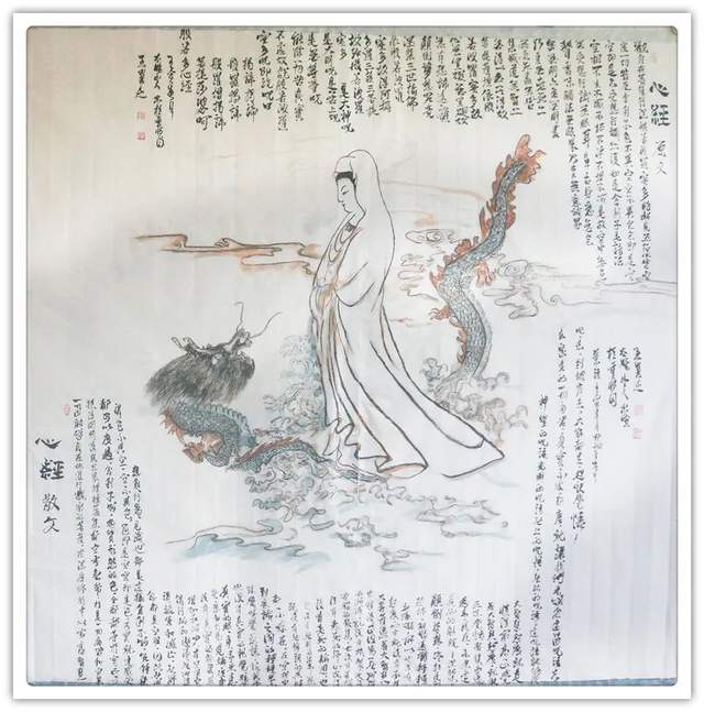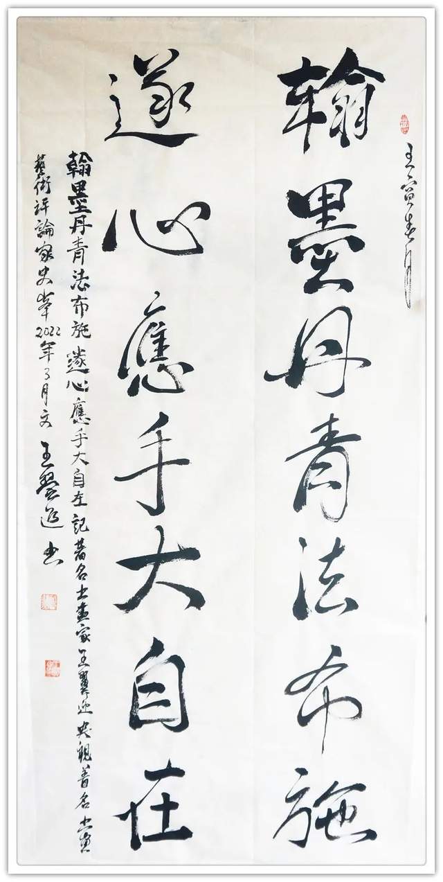 翰墨丹青法布施,遂心应手大自在。王翼迎创作绘画作品,有法布施的无量功德,走进他遂心应手写翰墨的世界,同样是法布施不遗余力。他的书法从深厚的碑帖功夫起底,然后再走进无法即是上法的新境界,通过笔与心合,墨与念融的创作,把点划写得天质自然,毫不造作。不故意,遂心而写书法,录经文其福德不可思量,写春秋文化格局让人仰观崇敬。只要像王翼迎先生这样,有了深厚的修养,再经由艺术与修行的双重加持,就可以让书画充满弘法布道的伟岸力量!