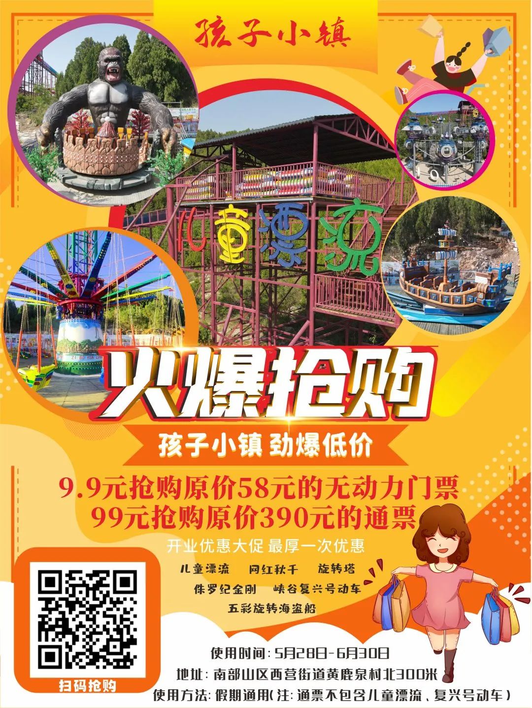 9.9元抢购原价58元的无动力门票!99元抢购原价390元的通票!今年端午节放假版“爸爸妈妈去哪里?乡村“迪士尼乐园”孩子小镇开业了。儿童漂流侏罗纪金刚旋转塔小海盗船网红秋千峡谷动车!孩子们更喜欢!更高兴了!