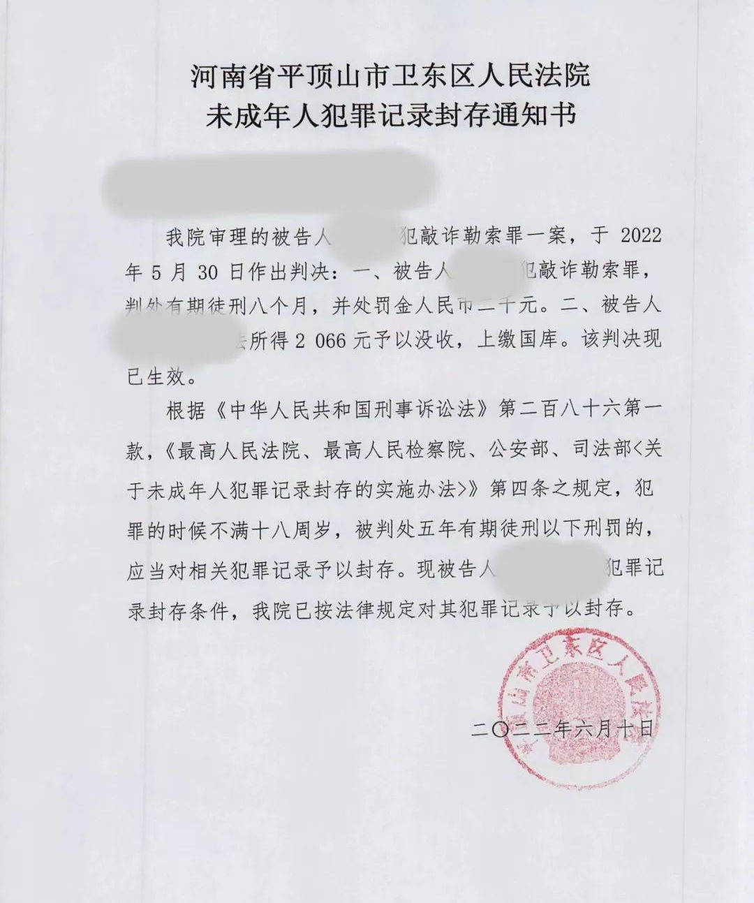 为全面贯彻落实《实施办法》关于封存未成年人犯罪记录的具体要求,切实保护未成年人合法权益,让未成年人“无痕”回归社会,6月10日,卫东法院发出全市首份《未成年人犯罪记录封存通知书》