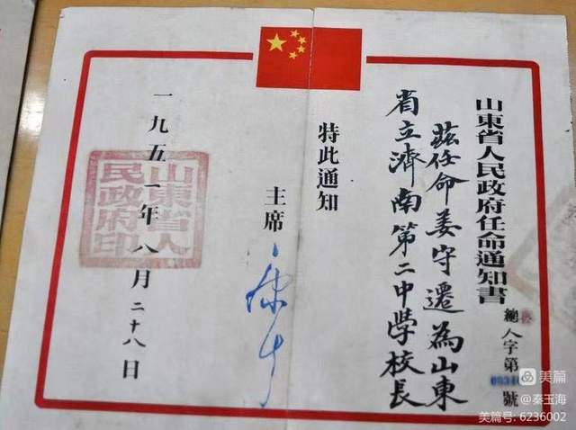 (图9 山东省人民政府任命通知书, 照片为姜校长的公子, 姜宝宁学长提供, 学长秦玉海技术处理)