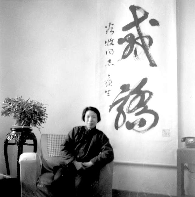 (图4, 四十年代末济南市长为谷牧, 其夫人牟峰毕业于济南二中的前身济南女子学校, 图为老学长牟峰照片, 其身后的书法为康生送给谷牧的作品, 照片由秦玉海学友提供)