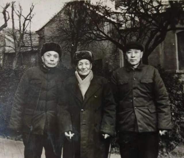 图10, 姜守迁老校长(中)和原山东省副省长余修(左), 原山东省人民政府办公室主任, 后山东劳动厅厅长侯林翼(右)合影, 老照片由学长姜宝宁提供