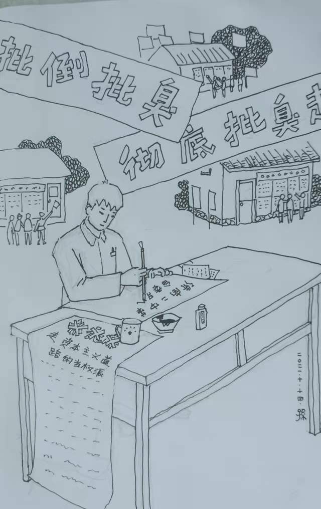 (图12 趁着抄写大字报, 练习书法, 莲君绘图)