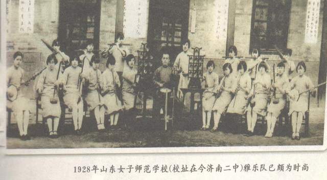 (图2, 1928年济南女子师范学校的雅乐队已经颇为时尚, 照片翻拍于程鹏主编的海内此城古, 济南故事多一书)
