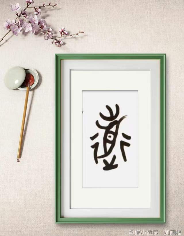 (图1 金文”道”字, 作者鲁安书写, 甲骨文字源:表示人在十字路口行走, 脑要思, 眼要观, 足才能走正道, 字两侧表示彳亍,音chi chu, 街道中上为首部眼睛, 目上有天线为 先思后行, 道法自然, 下为足, 鲁安解字)