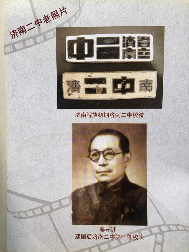 (图8 济南二中五十年代初的校徽和老校长姜守迁的照片, 源于校史展览馆, 秦玉海学长提供).