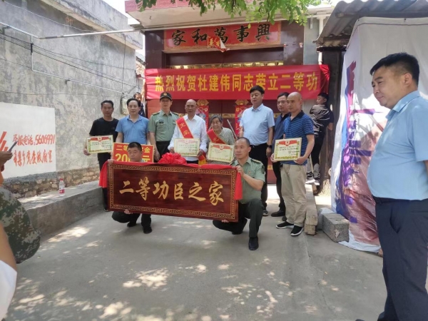 6月14日上午,河南省鲁山县张店乡邢沟村锣鼓声声,当地人武部和退役军人事务局相关负责人在乡村干部的带领下,打着横幅,举着喜报,来到村民狄桂红家,为其披上“光荣之家”的绶带,发放1000元慰问金。