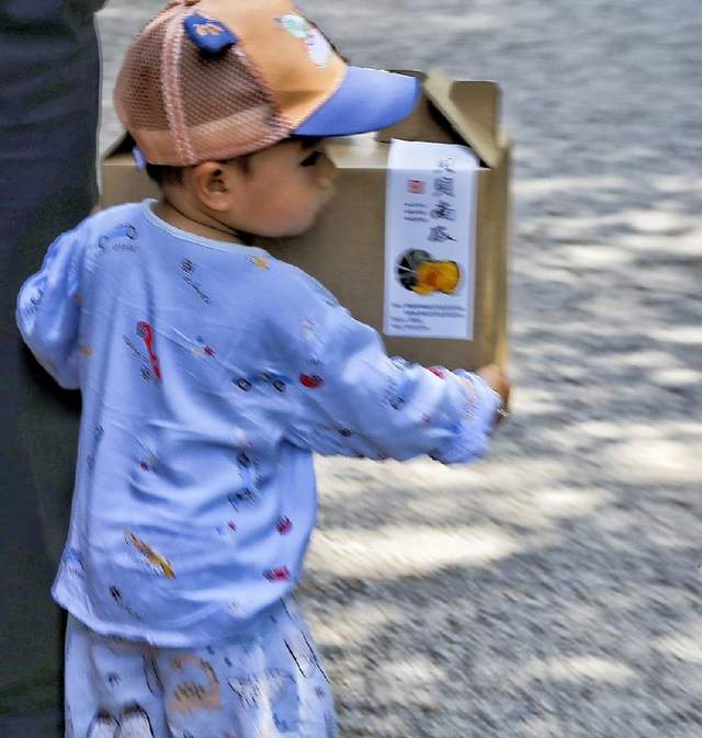 瞧!天真烂漫的小朋友在大人的呵护下,高兴地抱着心怡的贝贝南瓜,欢快地走来。