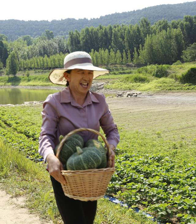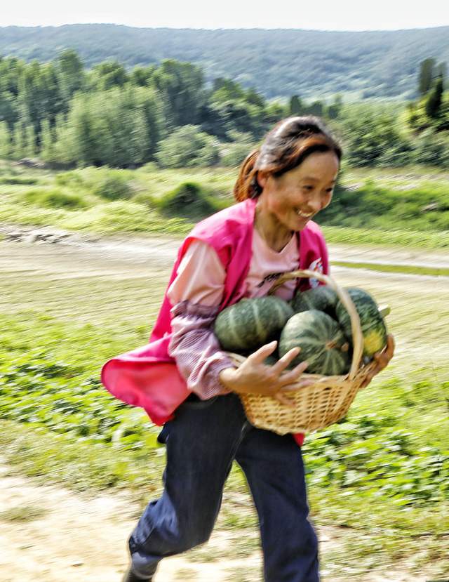 手捧装满贝贝南瓜的蓝子满面春风、疾步如飞奔向目的地。