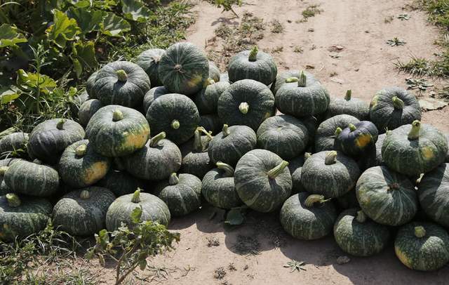 采摘的南瓜堆放在田间地头,静静地等待着早已投放定单的客户,装车进城入超市,走向人们的餐桌。
