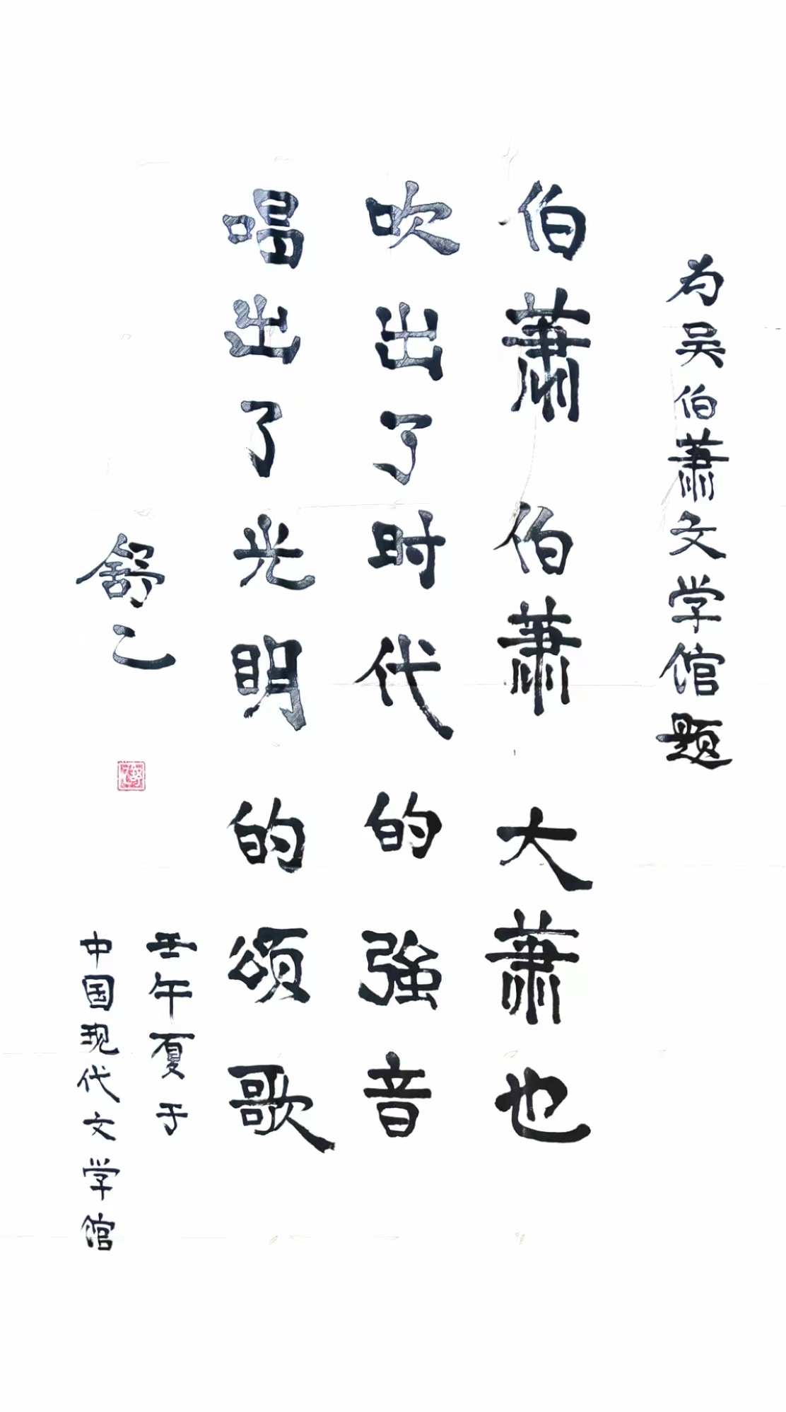后来,记得回莱芜不久,就收到了经张教授之手转来的舒先生的题字:“伯箫、伯箫,大箫也,唱出时代强音,吹出光明颂歌”。这苍劲有力的大字,传出的不仅仅是舒先生对吴老由衷的点赞,更是对革命老区人民的一片深情。在写这篇回忆文章时,惊悉舒乙先生于2021年4月21日因病不幸逝世,在痛悼怀念之余,更深深地感谢,铭记先生当年的一片深情。