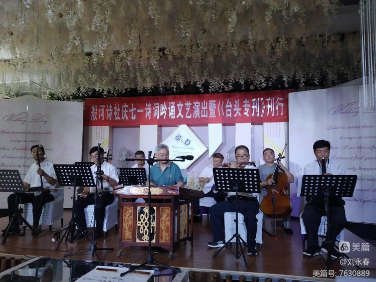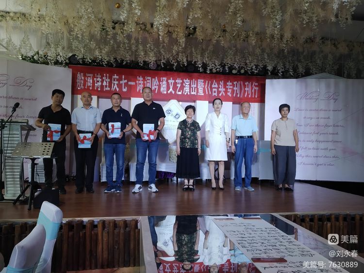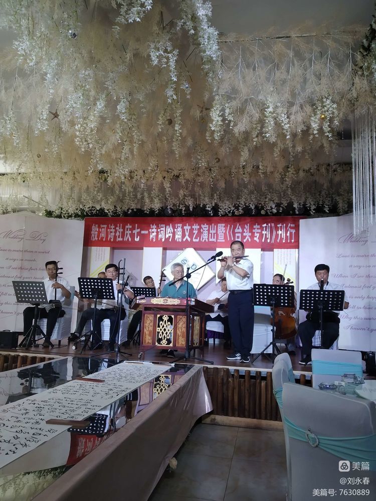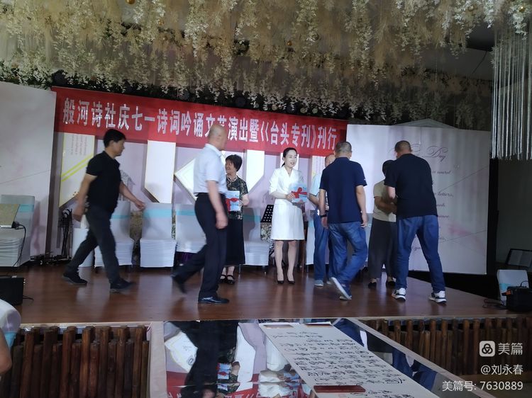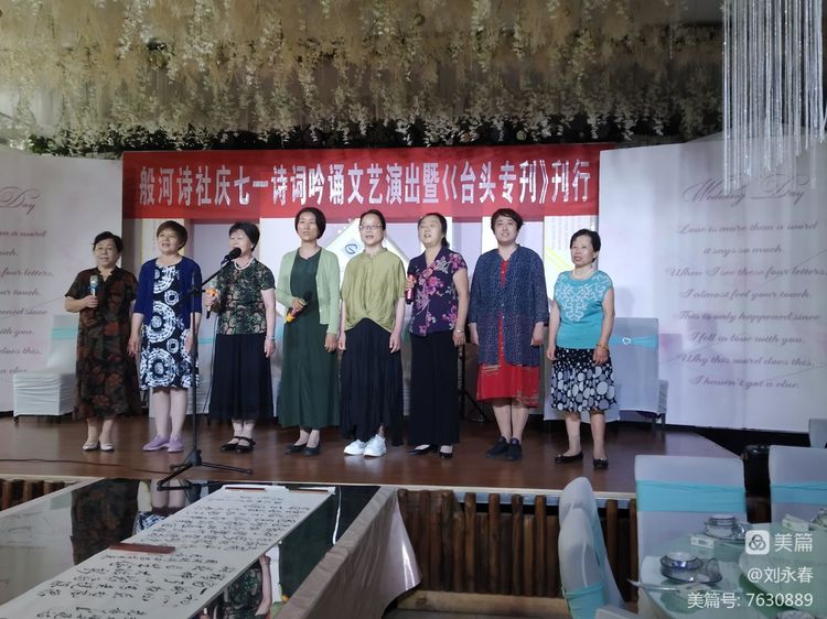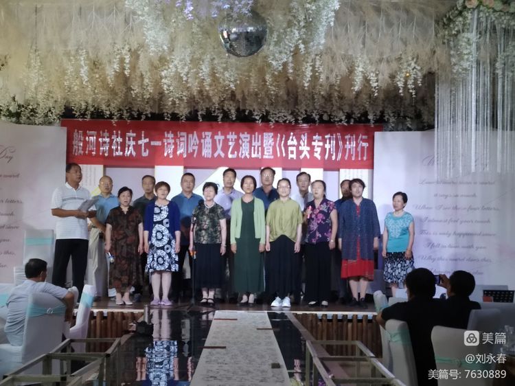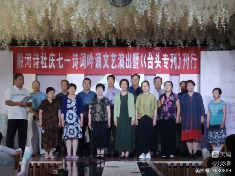 今天上午,淄川母亲河般河岸边,陶瓷古镇龙泉镇永兴大酒店,鼓乐声声,欢歌笑语,般河诗社庆“七一”诗词吟诵文艺演出暨《台头专刊》发行,在此如期举行。区文联主席李红蕾、诗词学会会长许永兴、龙泉镇教科文卫服务中心主任孙凌云,以及学会理事单位和诗词学会会员参加。诗词学会会员和连强艺术团进行了诗词吟诵和表演了文艺节目。