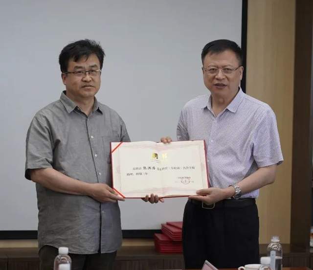 山东出版集团总编辑迟云为中国作协副主席、《万松浦》名誉主编张炜颁发聘书