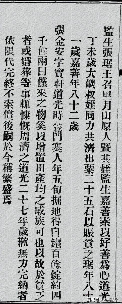 “监生张琚,王召里月山原人,及其侄监生嘉善,素以好善为心,道光丁未岁大饥,叔侄同力共济,出粟二十五石以赈贫乏。琚八十一岁、嘉善八十二岁卒。”