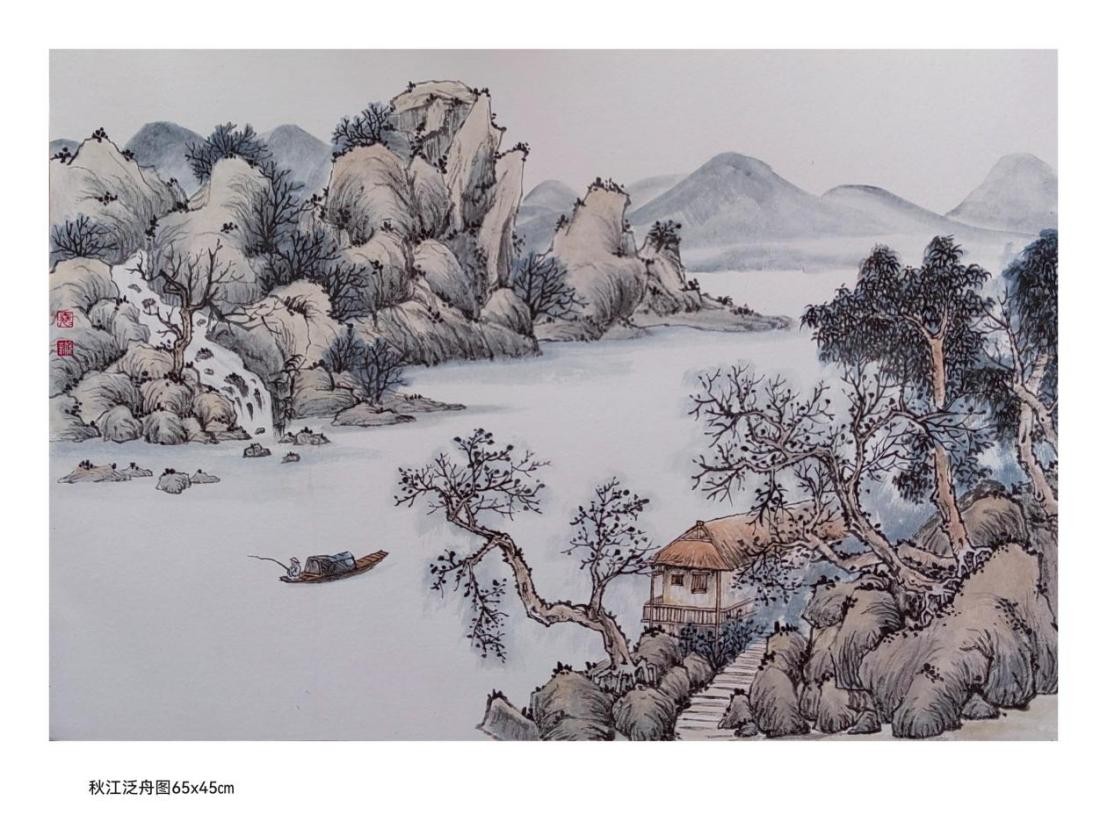 作品讲述: 这是一幅小写意的传统山水画。画家采用“勾、皴、擦、点、染”技法,将山石层叠、树木的苍劲描绘得淋漓尽致。画面素雅清爽,江水清清,小路通幽,树木葱茏,山峦绵延。一老翁泛舟江上垂钓,悠闲自得。