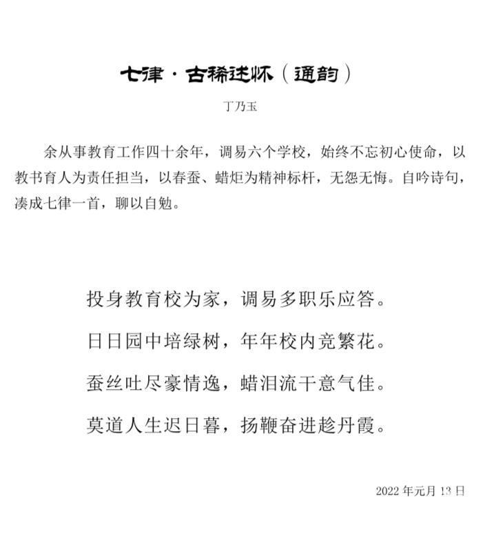 丁乃玉先生,淄川区老年老干部书画两会常务副会长。1953年出生,大学本科学历,中学高级教师,从事教育工作四十余年,为淄川区教育事业做出了很大贡献。退休后以翰墨为伴,担任将军路分会领导职务,多年来,以弘扬书画传统文化、传承书画艺术为宗旨,为提高会员的书画创作水平,给会员开设专题书法讲座,围绕所在社区文化建设需要,主动参与社区文化活动。响应区学会号召,积极组织写春联、送祝福、进万家活动,无偿捐赠社会各界书法作品600多幅,他的书法作品在全国、省、市等组织的书画展览或大赛中屡屡获奖,其行书作品《董必武诗六首》被董必武纪念馆收藏。