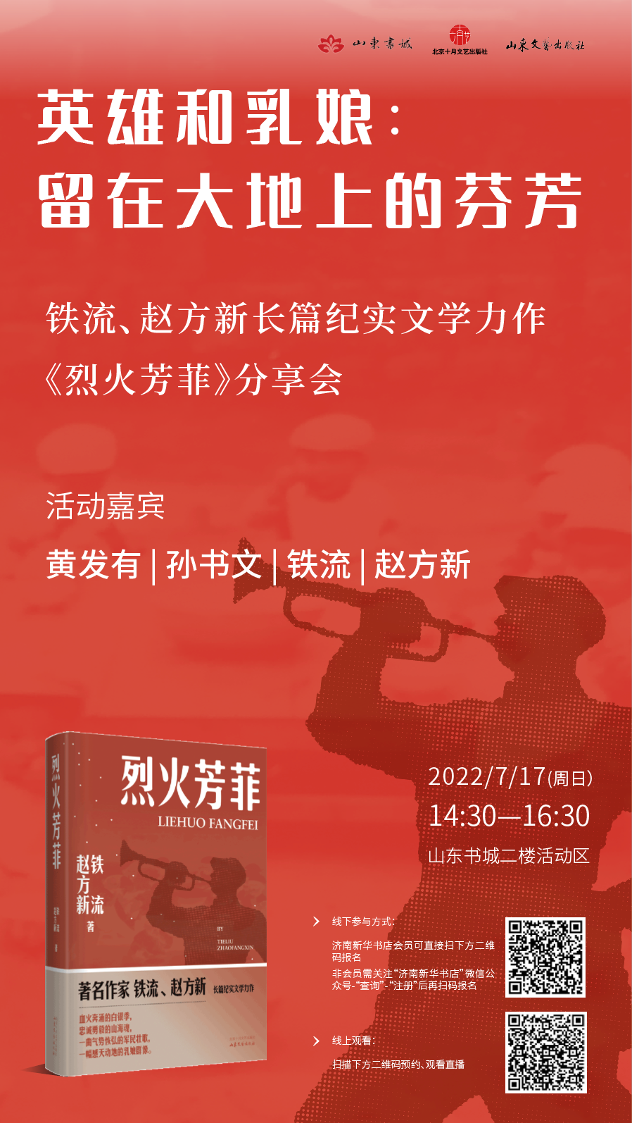 7月17日(周日)下午14:30,著名评论家、山东省作家协会主席黄发有,山东师范大学文学院院长孙书文,以及《烈火芳菲》作者铁流、赵方新,将做客山东书城,带您走近这段隐秘的历史真相。