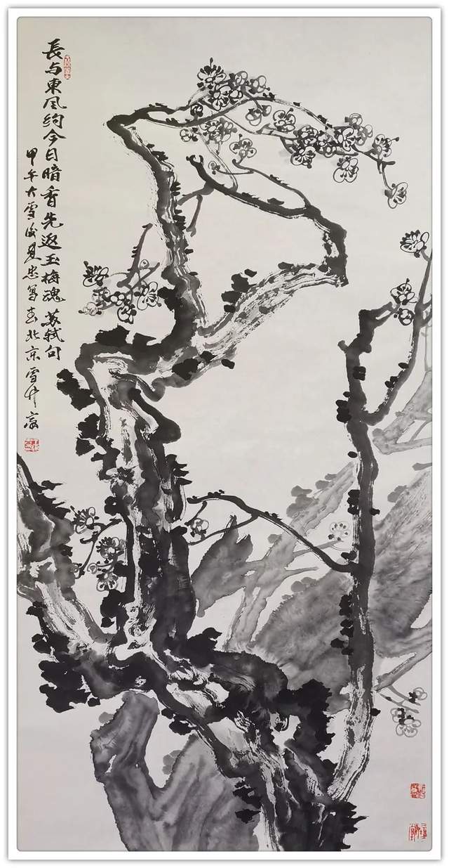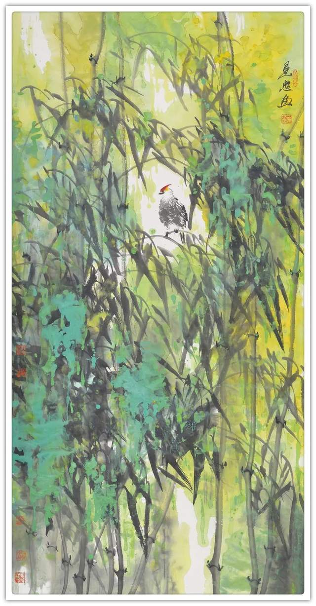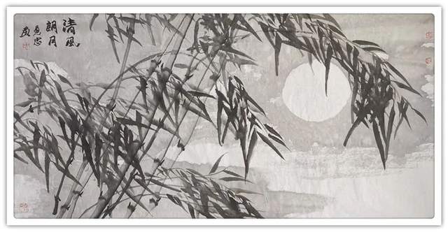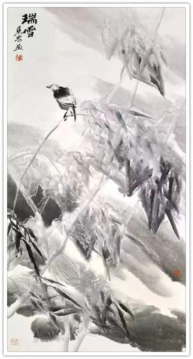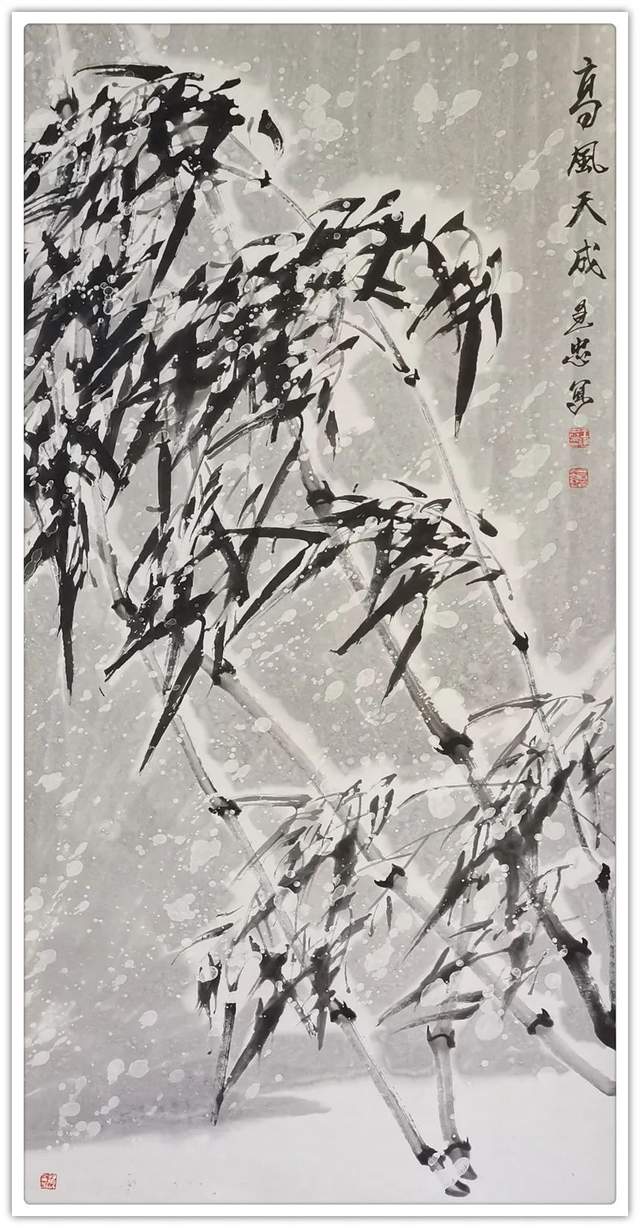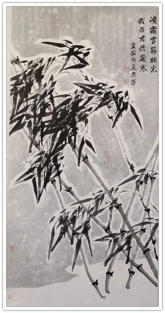 雪竹霜松不老身,尽教后进笑陈人。相逢亦有吟诗客,谁似先生语意真。冰雪玉竹,画中极品,古人云:“一生兰花半生竹”,可见画兰竹之难,王建忠先生画竹五十余载,已达到出神入化之境。先生的雪竹图,立足传统,融古汇今,锐意创新,独具风貌;他以劲直润泽的线条驱动,水墨化机的意蕴,为我们营造一个冰清玉洁、水墨淋漓的清雅世界。他的竹子在继承传统的基础上,更具有自我抒情的文人意趣;他以多种手法综合的水墨韵味之美学表达,让我们感受到新时代水墨的艺术气息。雪竹低寒翠,风梅落晚香。一杆瘦竹,承载冰雪之寒,湿重之压,更显劲挺有力,给人一种坚韧不拔,奋发向上的精神力量,每日面对此君,似有洗心净沐之感;正如宋代文人画家文与可说,班班堕箨开新筠,粉光璀璨香氛氲,我常爱君此默坐,胜见无限寻常人。