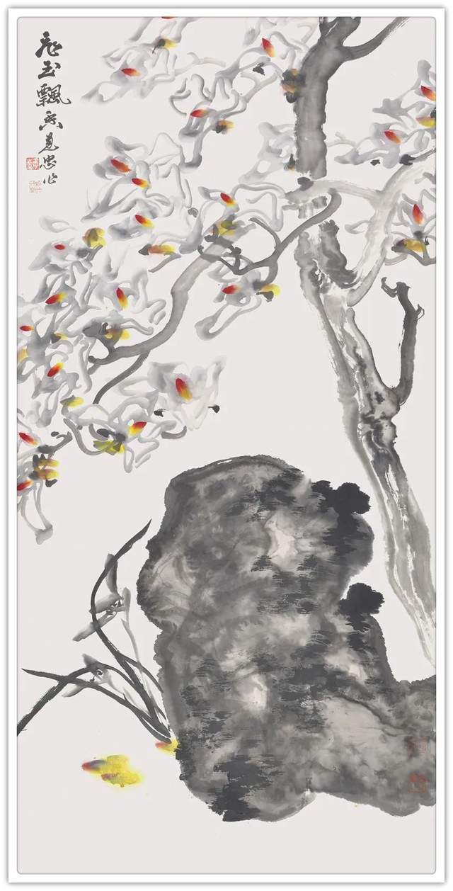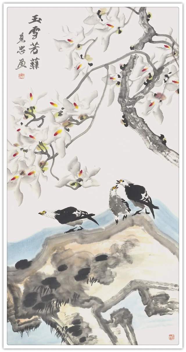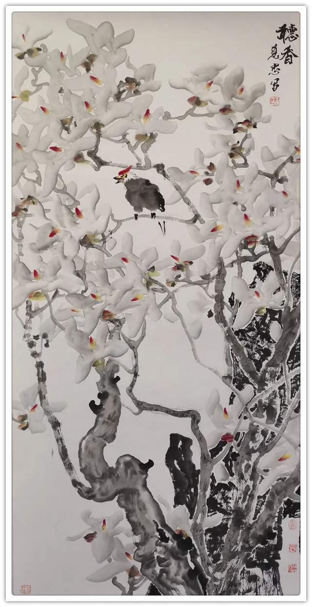 高树秀枝生白莲,春芳沾得牡丹前。东风昨夜化微雨,清晓千花玉戴烟。王建忠先生的玉兰系列作品,在柔美韧滞的线条中,展现玉堂满春,一片春光照眼的祥和之境。他以大写意的笔墨,以独创的没骨法,一笔成形,数笔成花,点出春光万朵,雪涛云海,蔚为壮观,洁白芳香,高贵出尘;若雪融冰消,白玉之润,晶莹剔透;若云烟冉冉,飘然欲飞;水墨氤氲,水气淋漓中,有玄鸟和鸣于枝叶间,富有一派和谐美满,雍容华贵的文化气象。