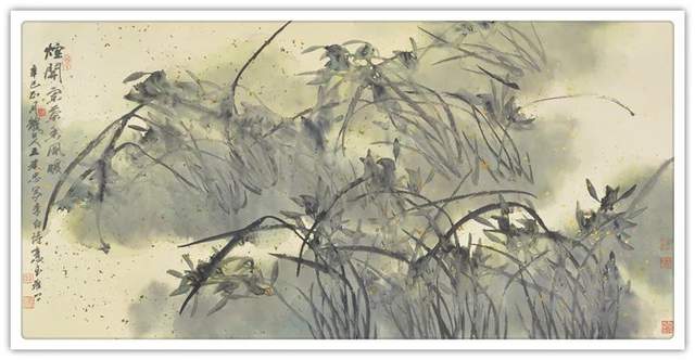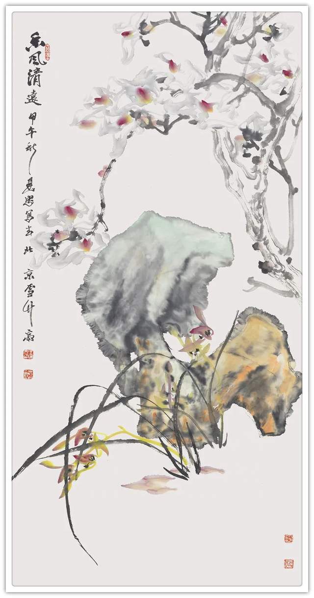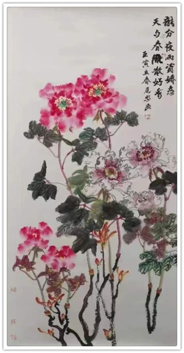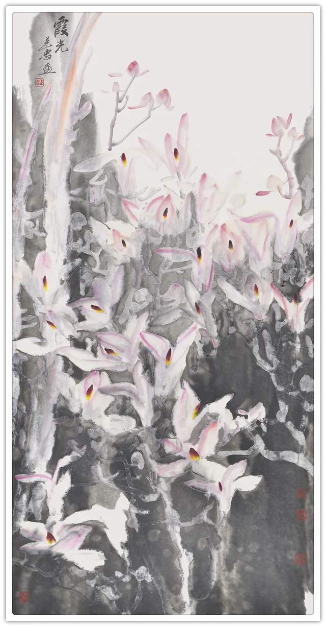 他以一位诗人的雅逸情怀,锦心绣口,蕙质兰心,幻化一派诗意盎然之境。菡萏半开别样红的荷花,透出“秀樾横塘十里香,水花晚色静年芳”的诗情画意。生在幽谷中的兰花,沐日浴露,笑靥半含还半吐,素心皎洁濯醍醐。他的梅花与雪争春,梅似雪,雪映梅,梅雪乱舞,乱红无数。他的牡丹,一枝红艳露凝香,若云霞,若锦绣,飘然衣袂,异彩纷呈;颇有李白笔下“云想衣裳花想容,春风拂槛露华浓”的诗意,在雅俗共赏间,让人有妙不可言的审美愉悦。