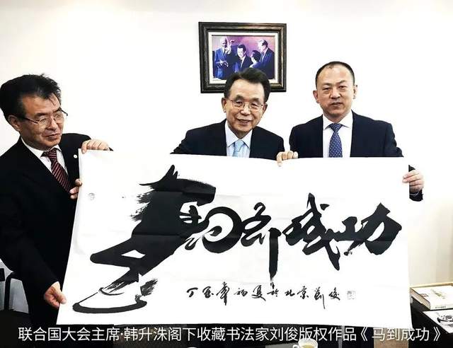 11月21日联合国第五十六届大会主席韩升洙阁下亲切接见中国艺术家代表刘俊先生,并得到韩升洙阁下亲笔题字赠书。